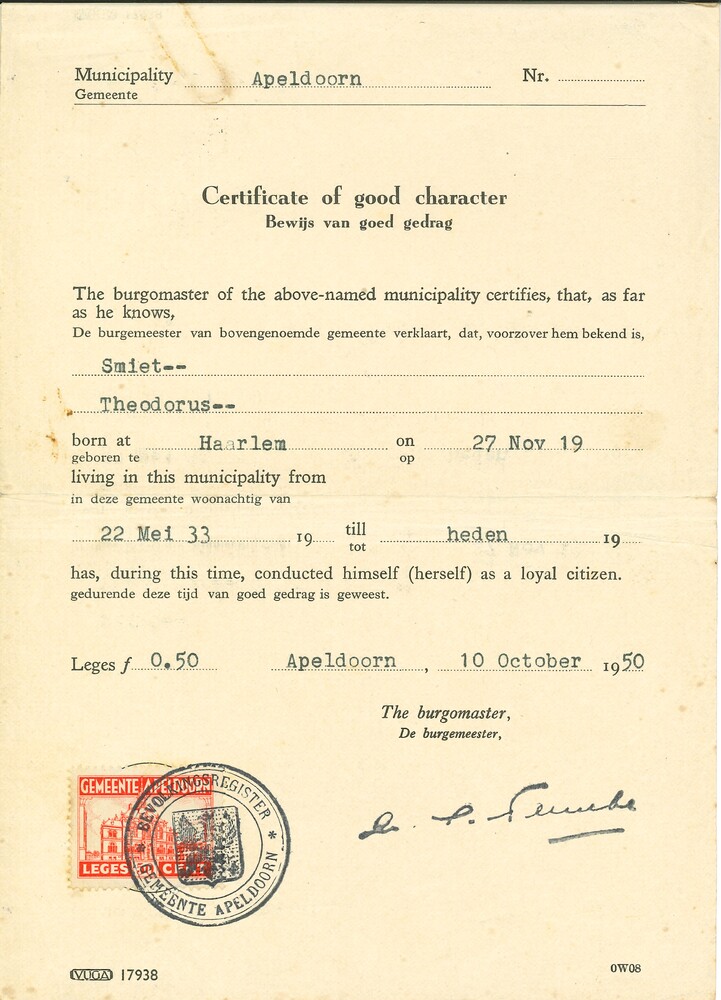 Bewijs van goed gedrag op naam van Th. Smiet.