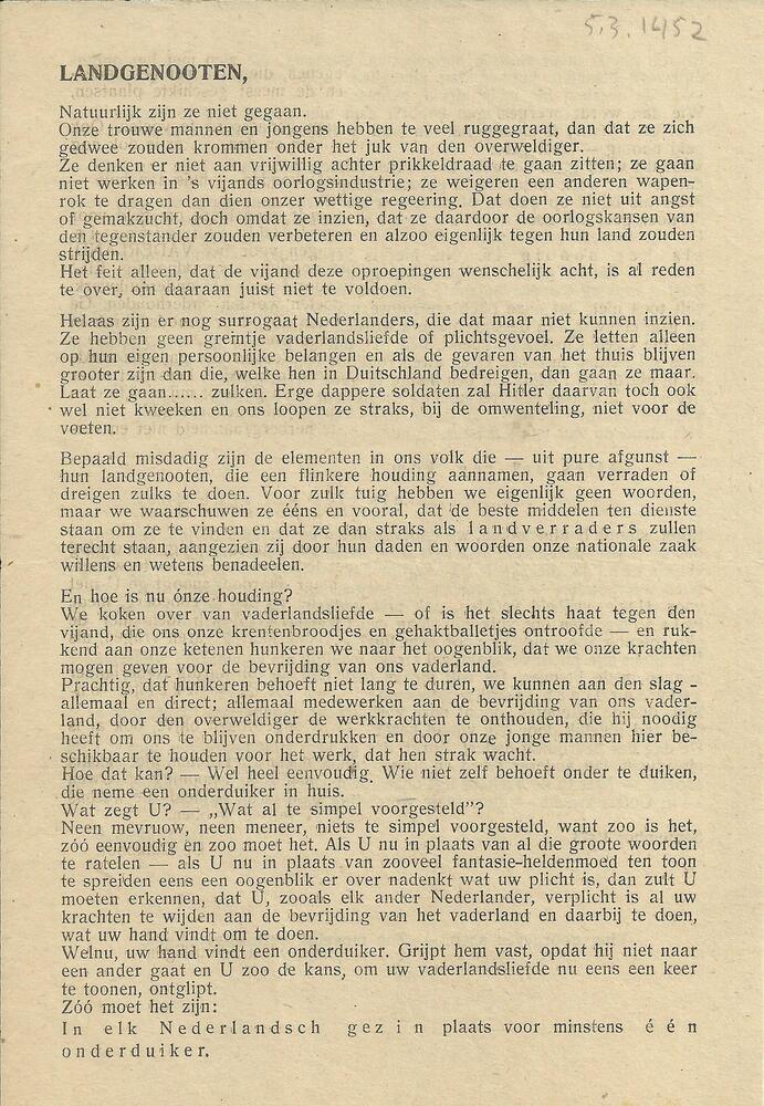 Map Illegaliteit - Pamflet: Landgenooten (Oproep hui...