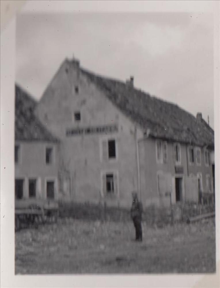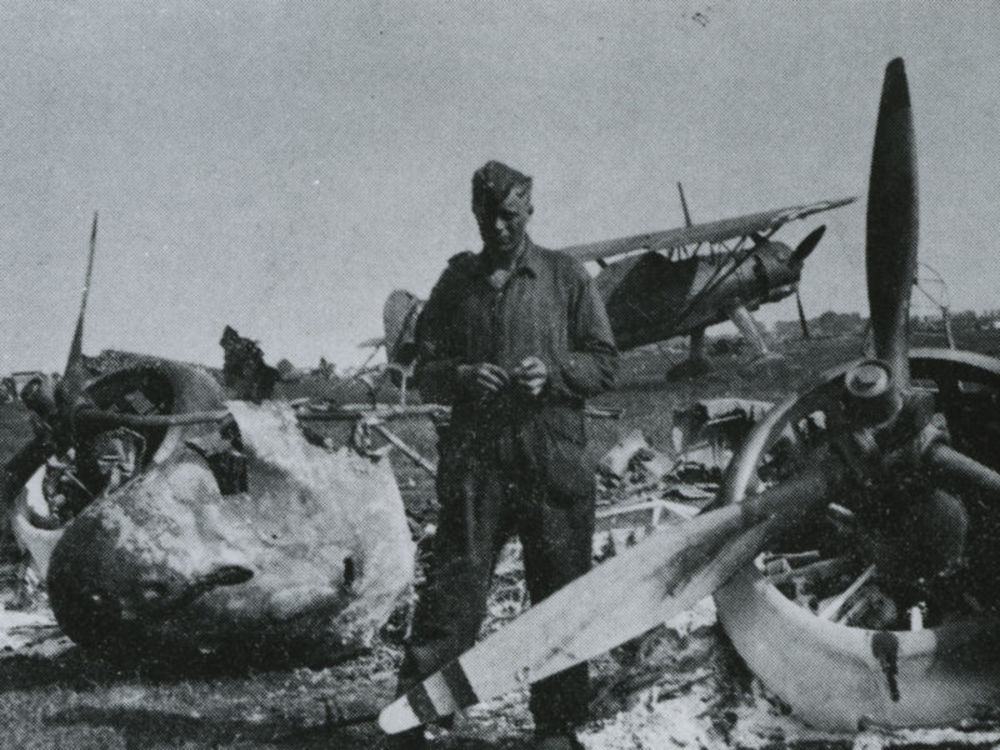 Foto van Duitse militair temidden van wrakstukken ui...