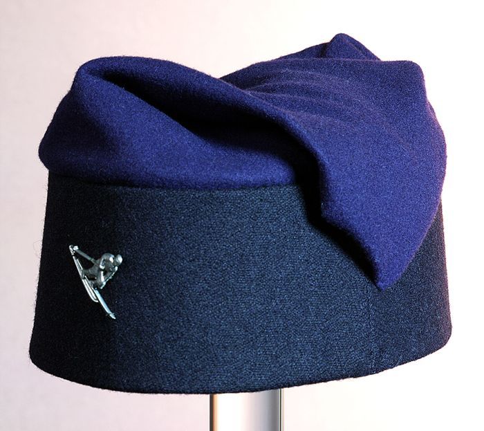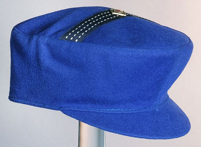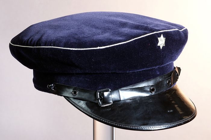 Donkerblauwe uniformpet van postbode met rode biezen...
