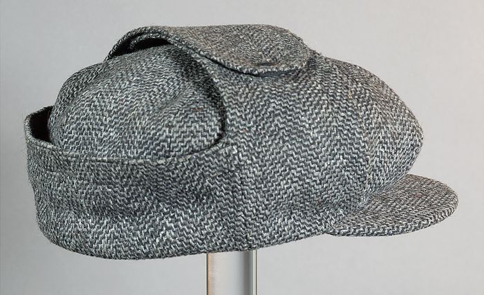 Grote herenpet met klep, grijszwarte wol met rode ru...