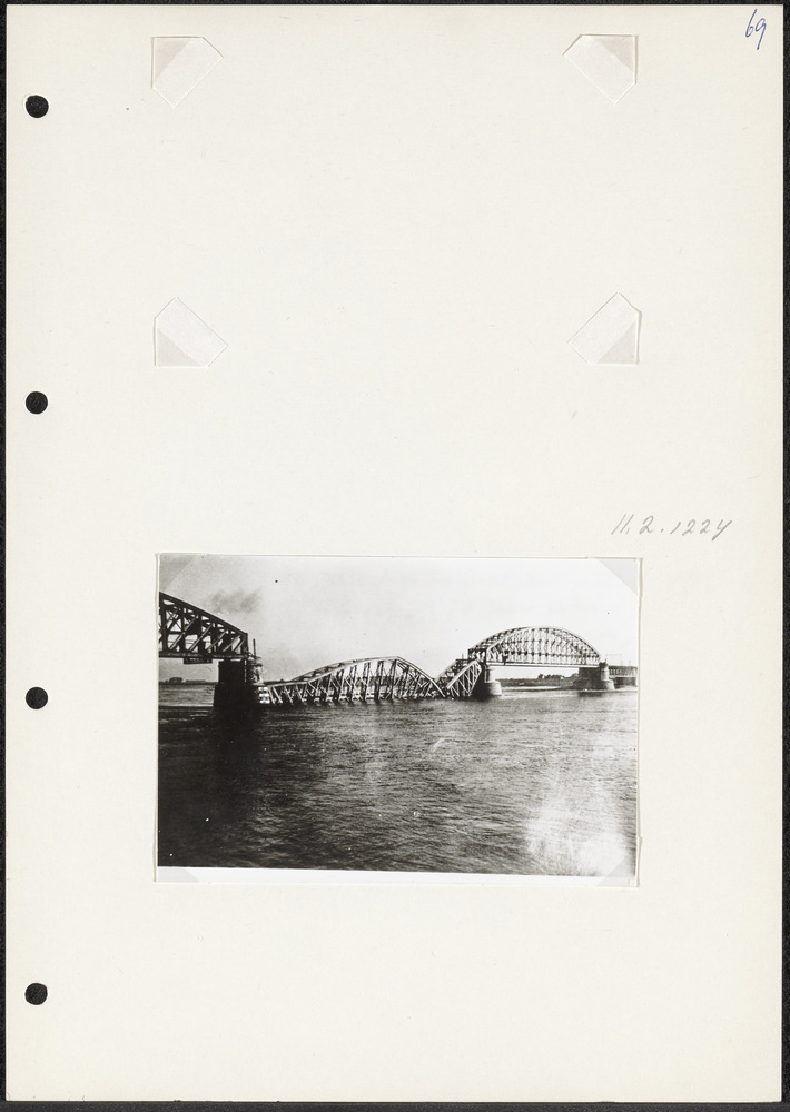 Foto opgeblazen spoorbrug te Nijmegen, mei 1940. Tek...