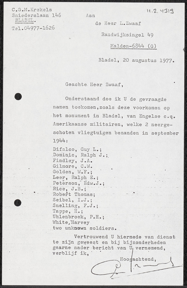 Note van dhr Krekels, Bladel 20 augustus 1977.