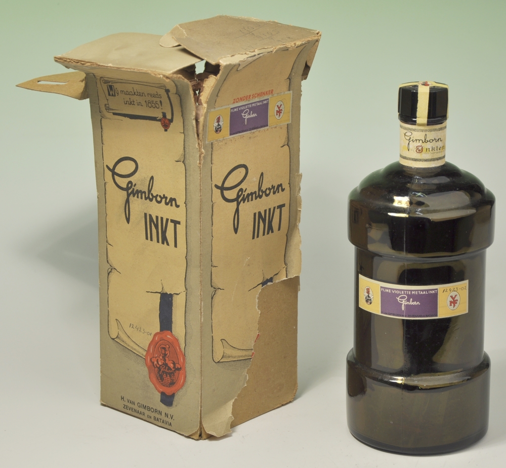 Doos van karton met daarin een glazen fles gevuld me...