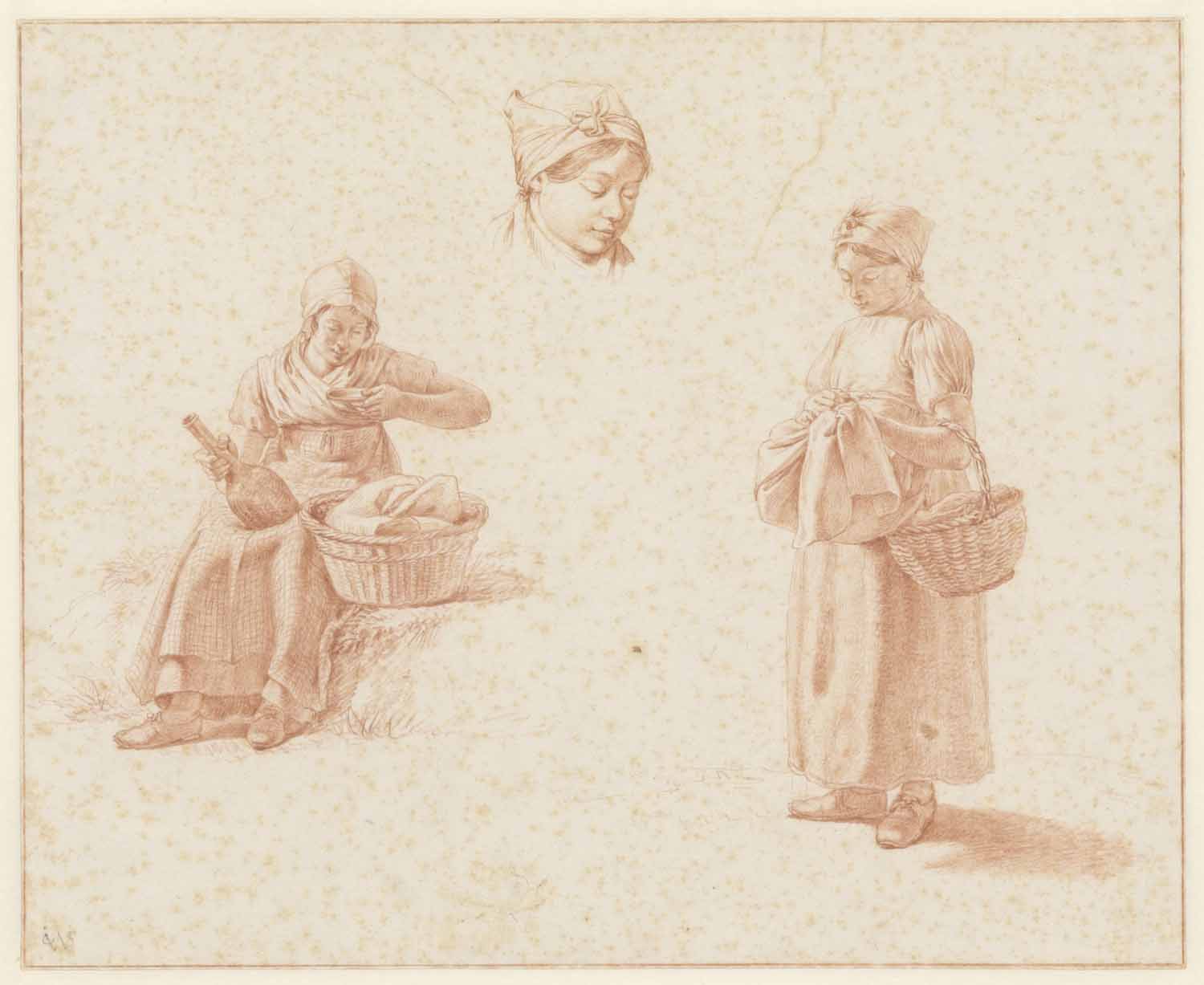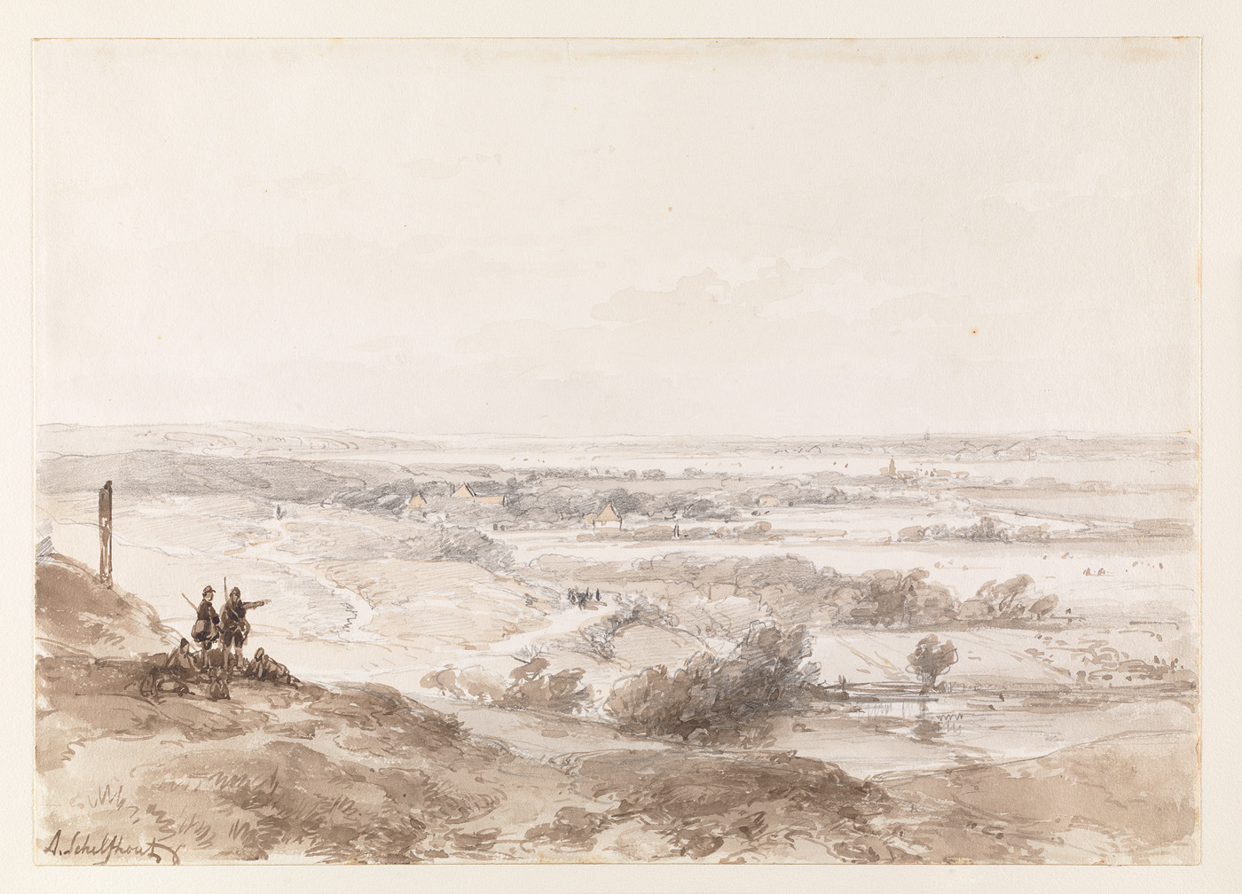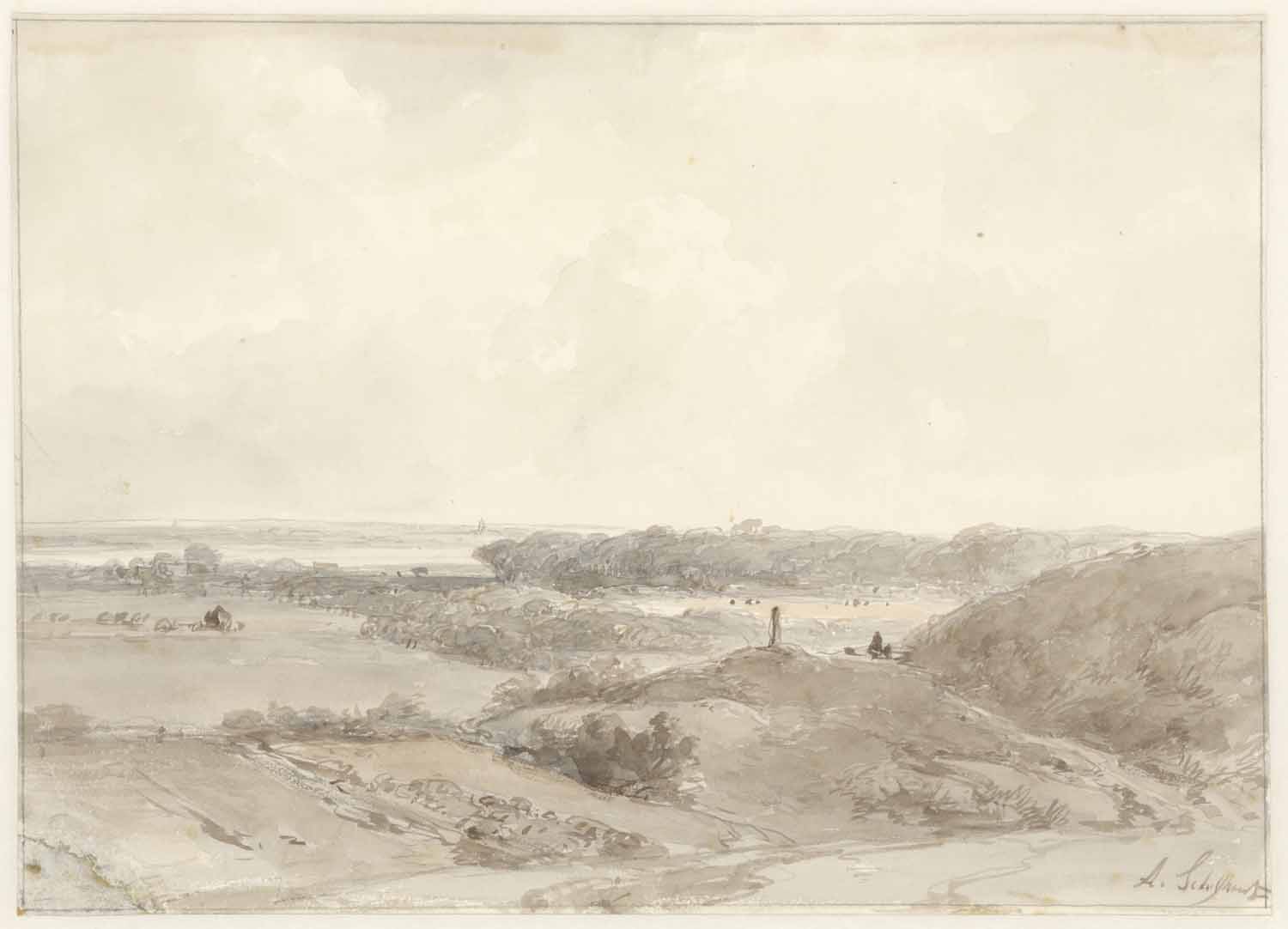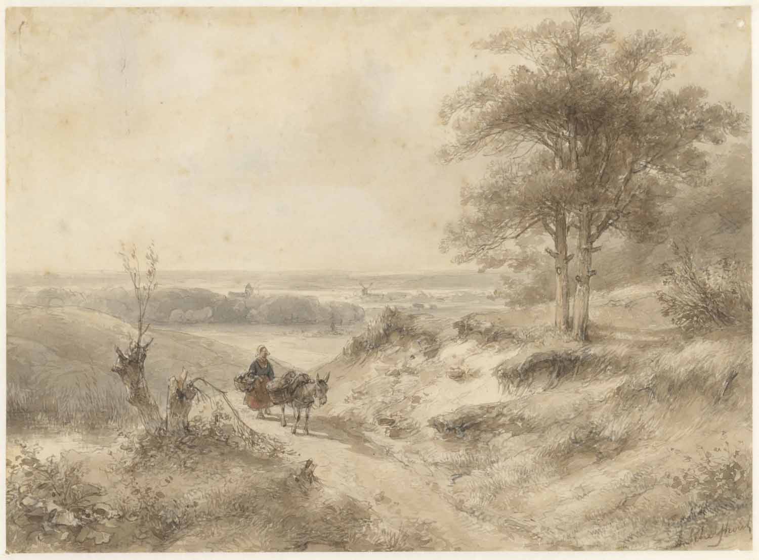 Eene vrouw bij eenen ezel in een duinachtig landschap