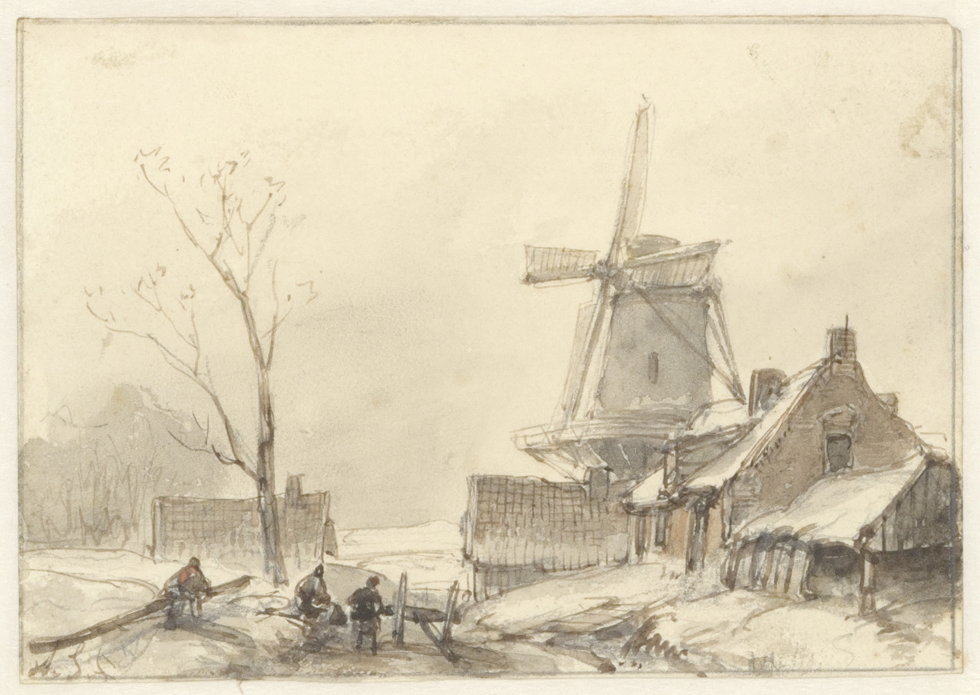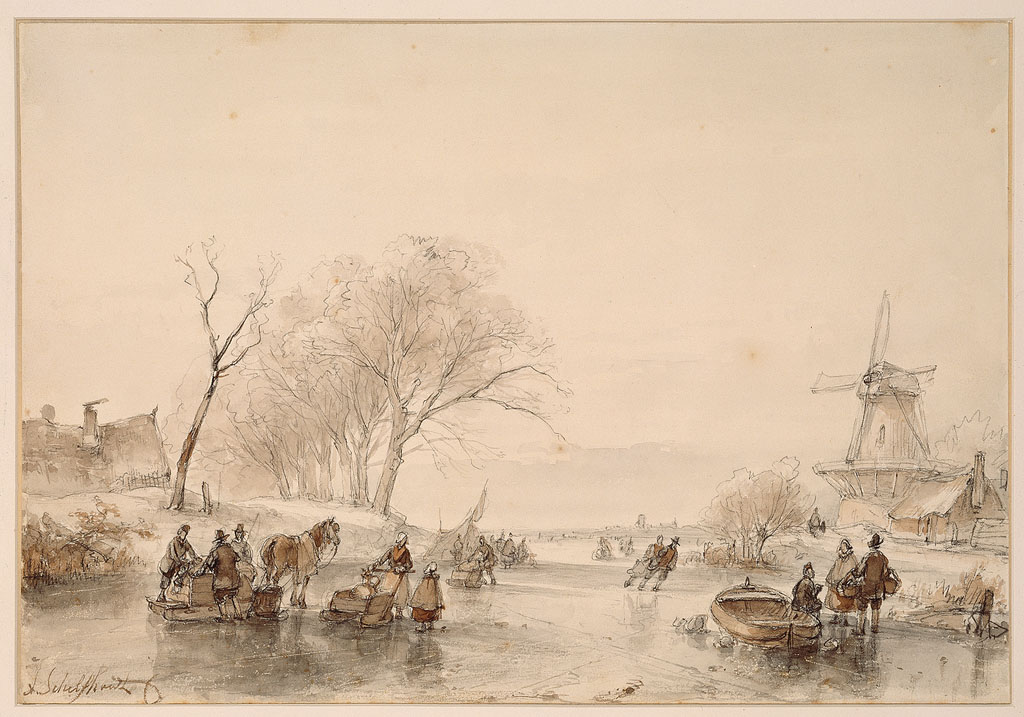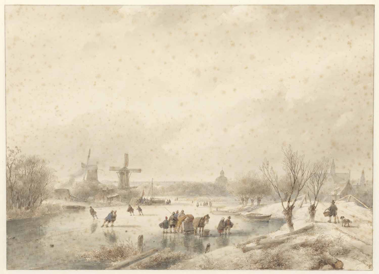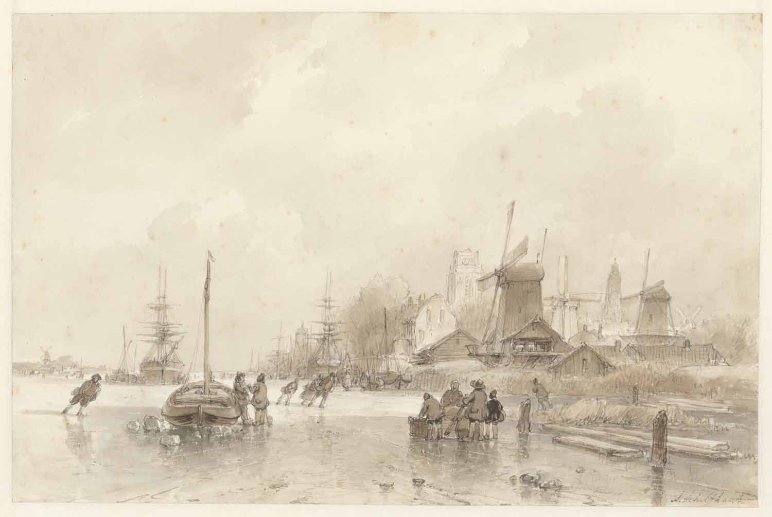 Gezicht op de Maas voor de stad Dordrecht bij winter