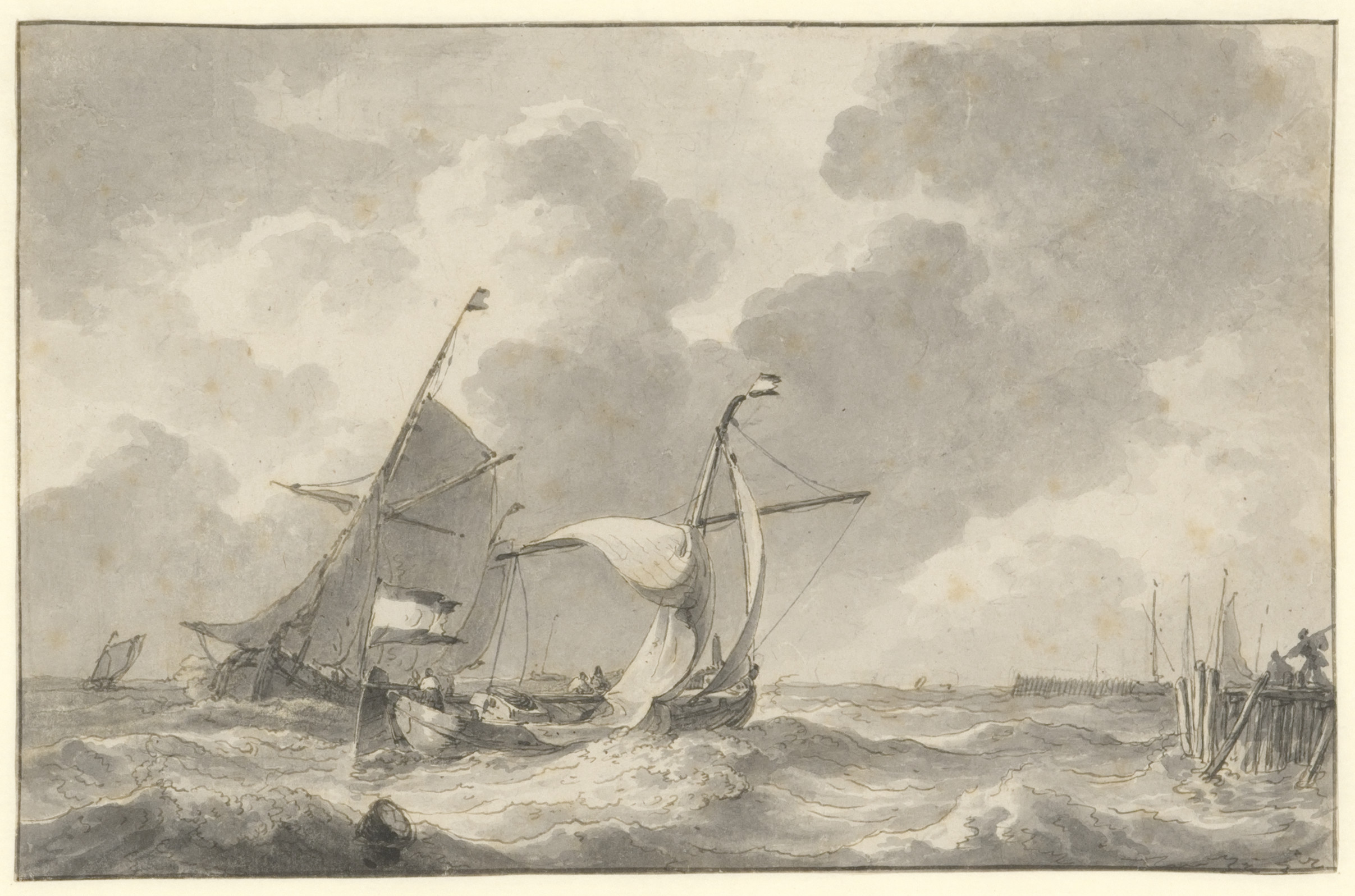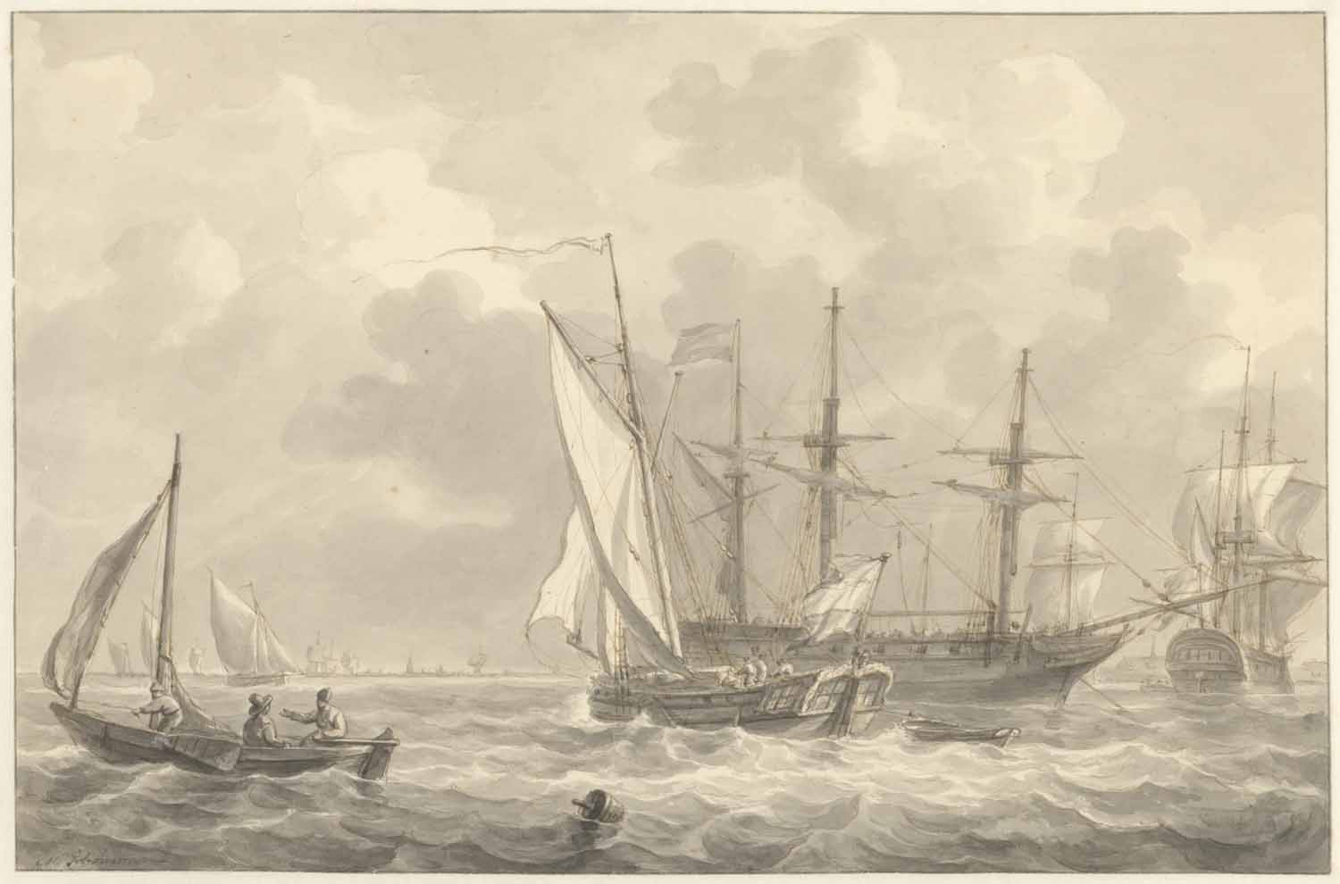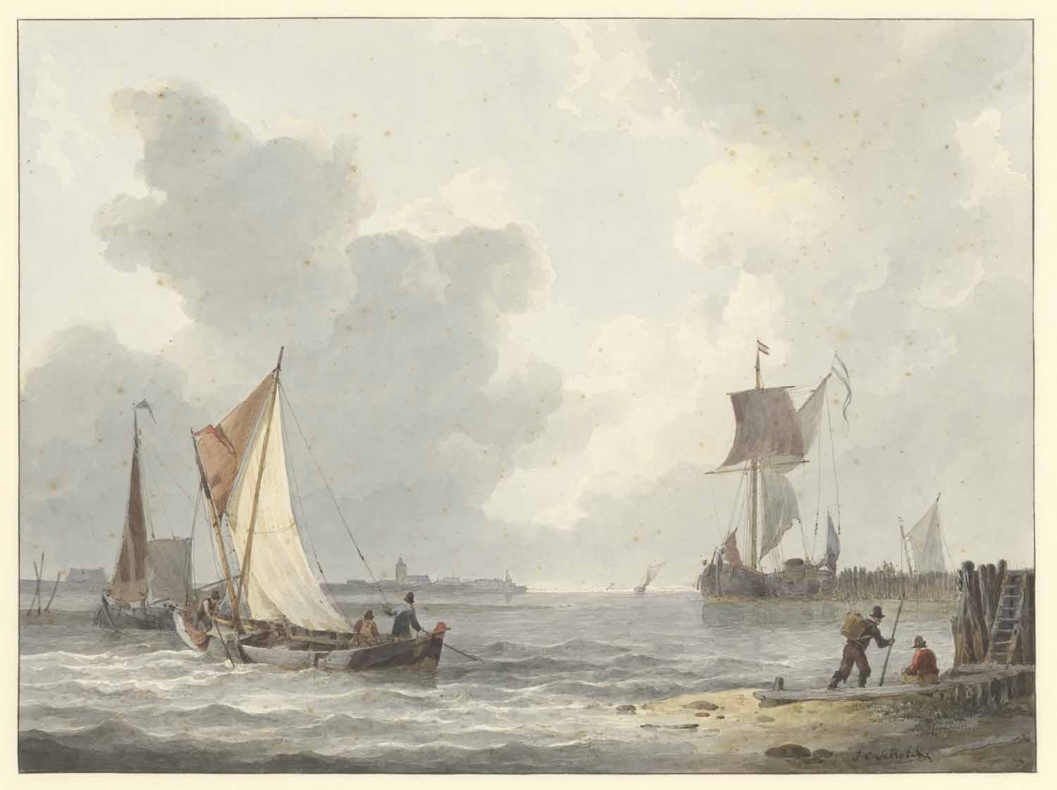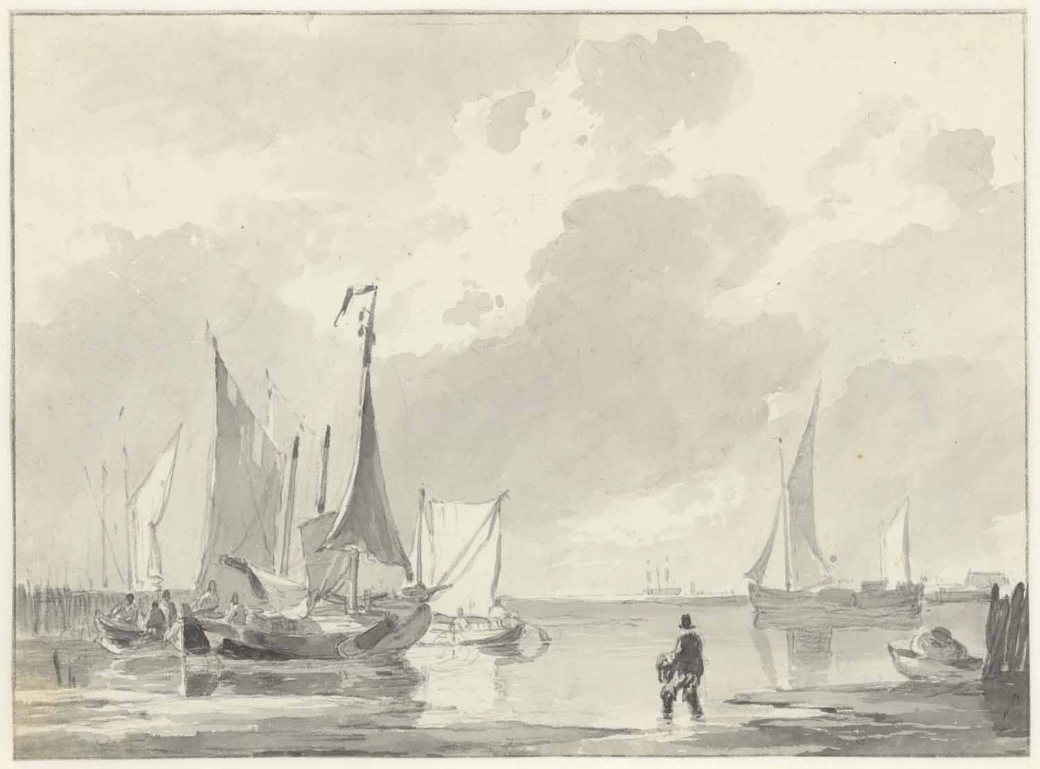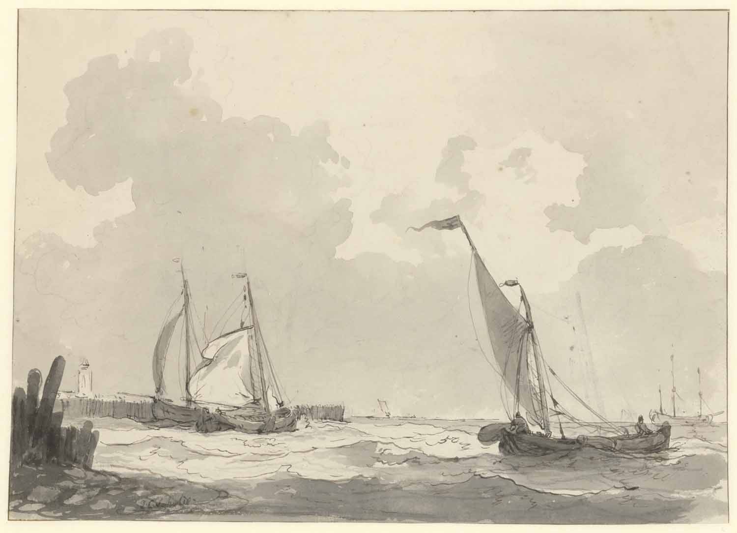 Het inkomen van twee beurtschepen in eene haven bij ...