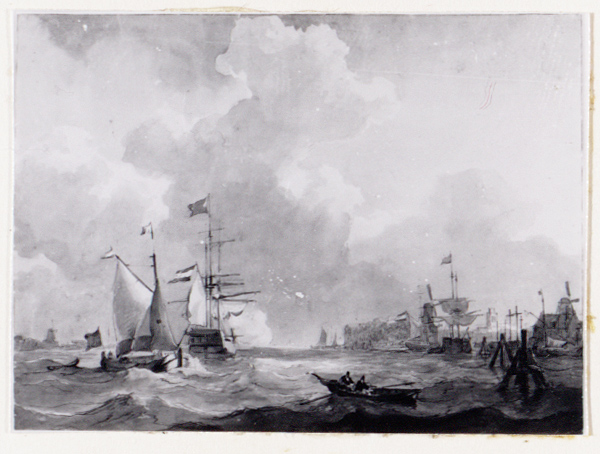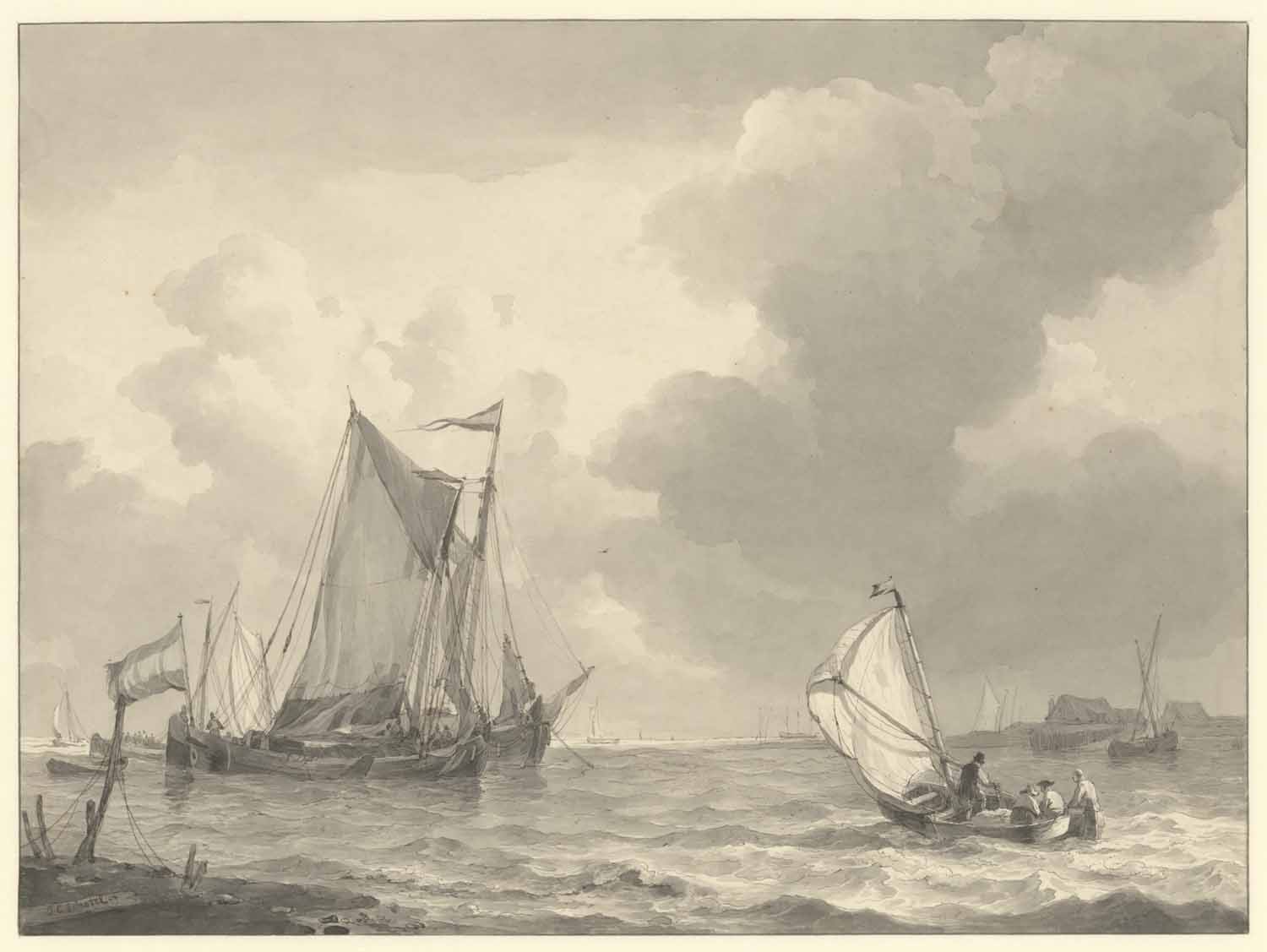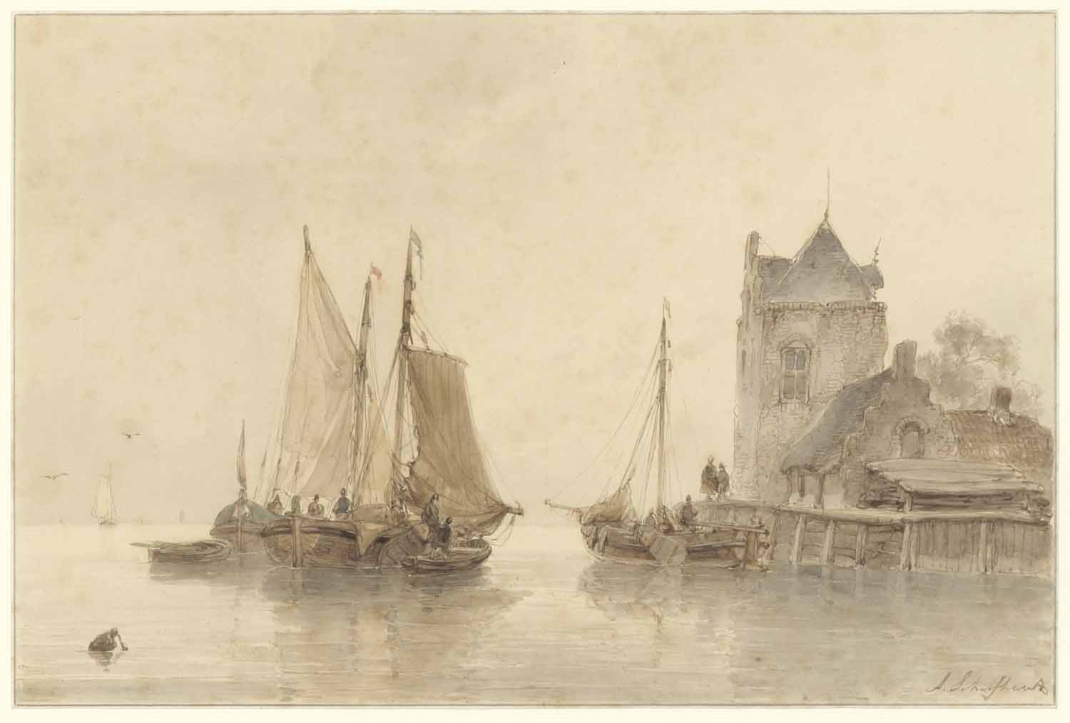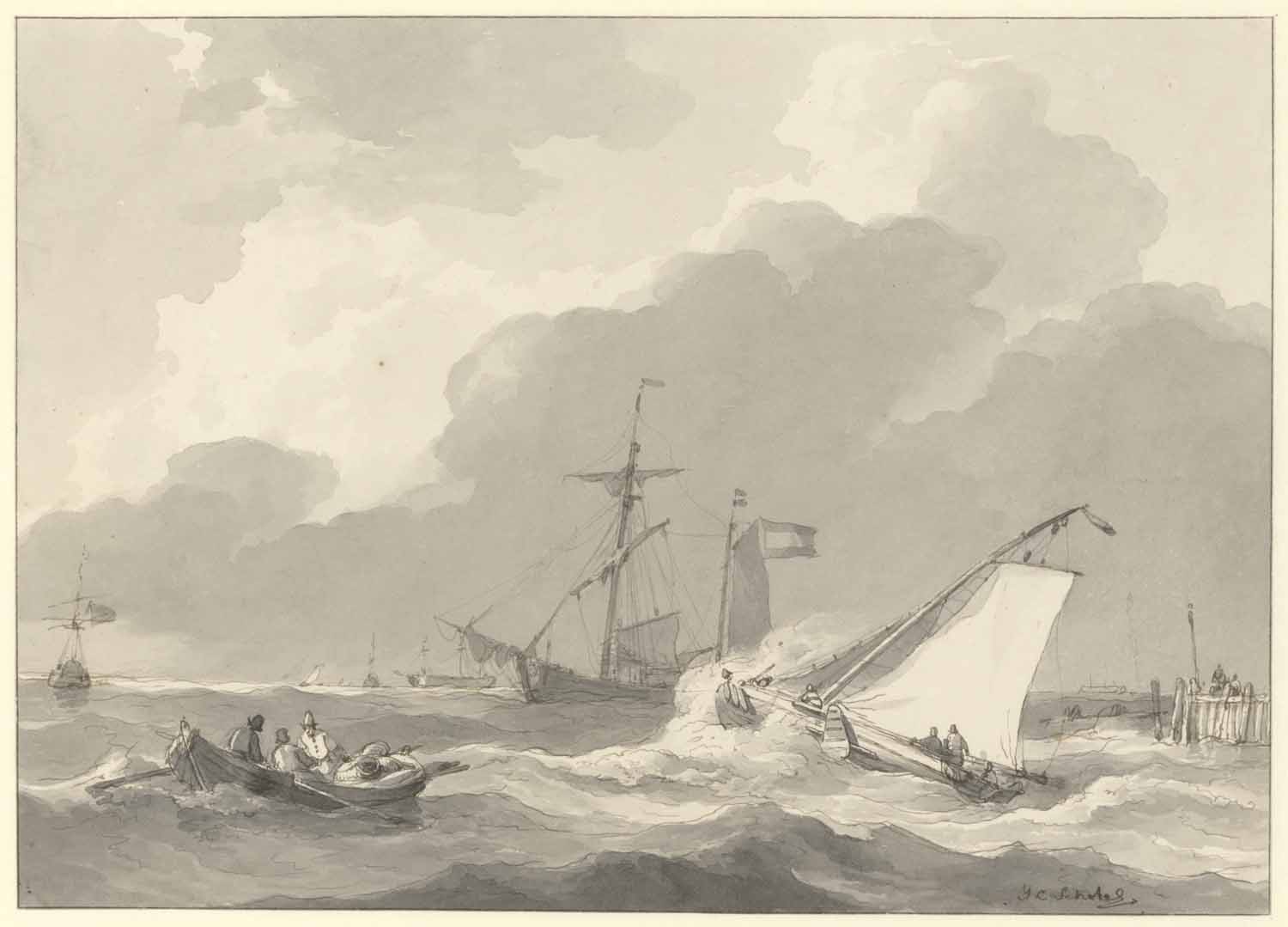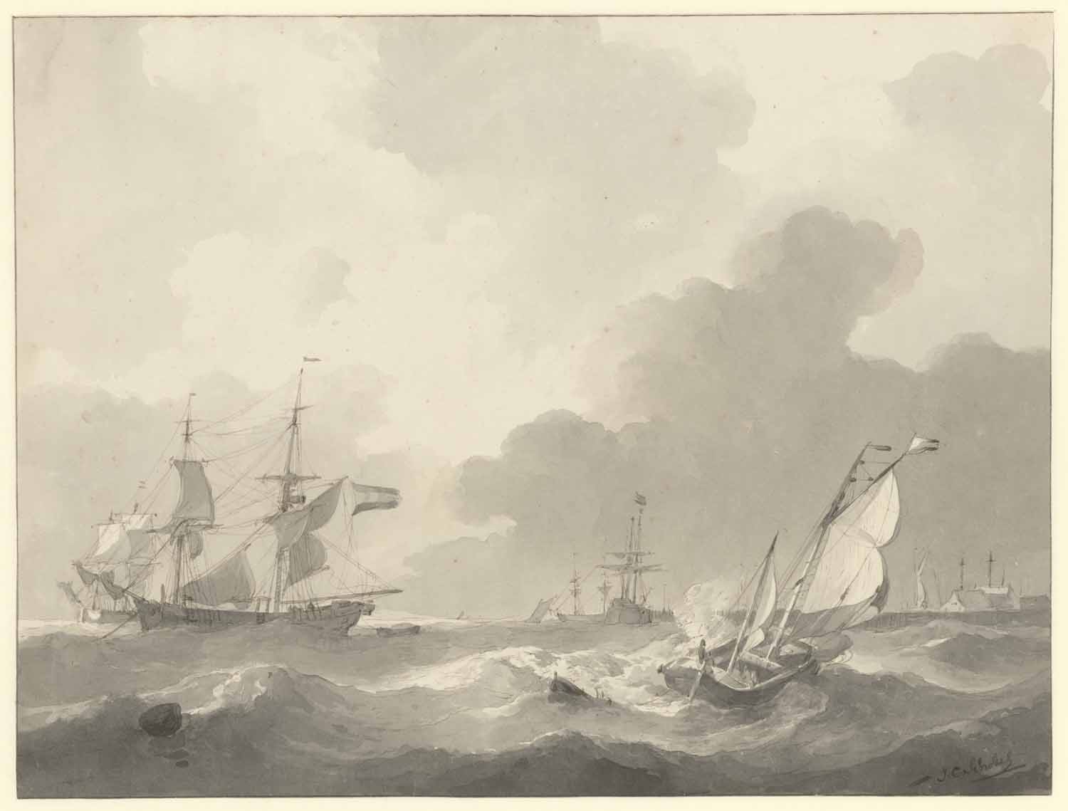 Het inkomen van twee beurtschepen in eene haven bij ...