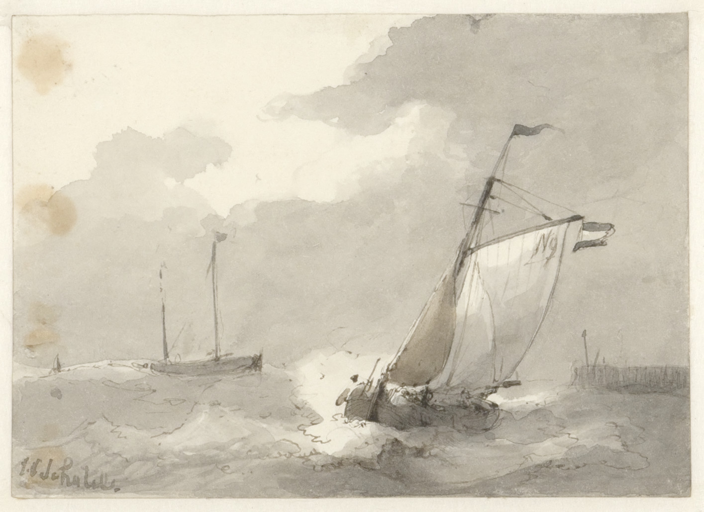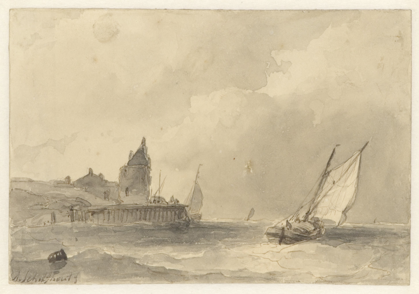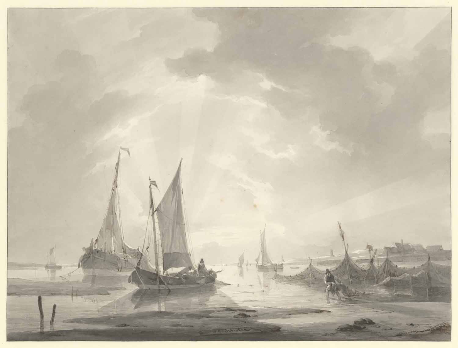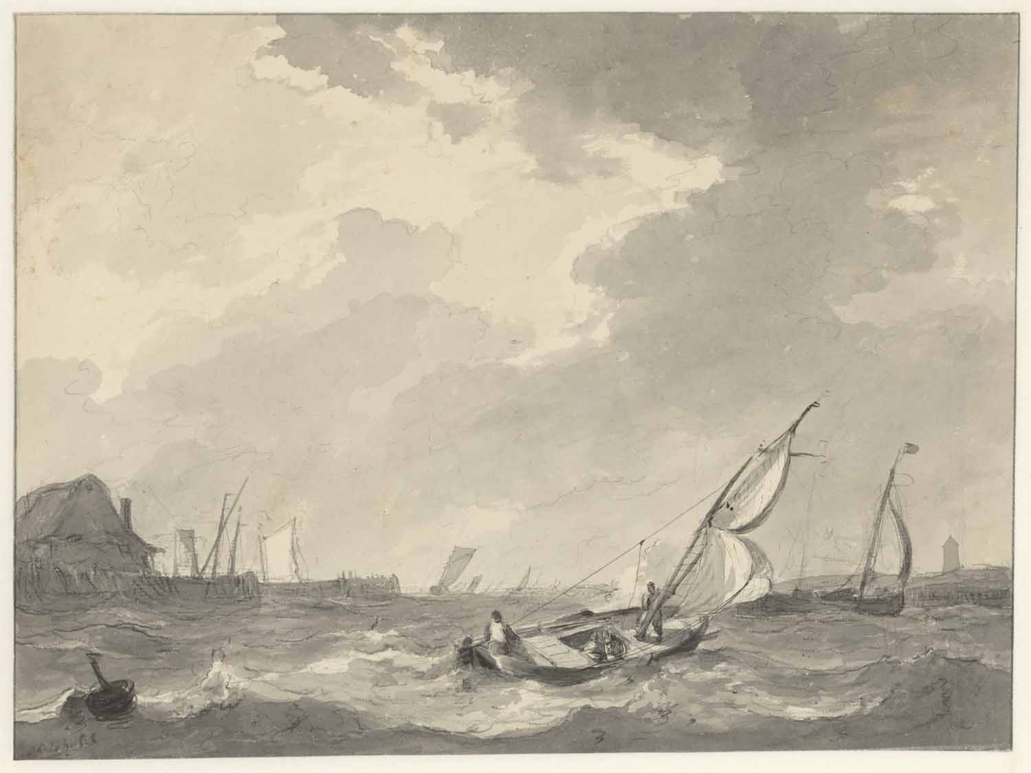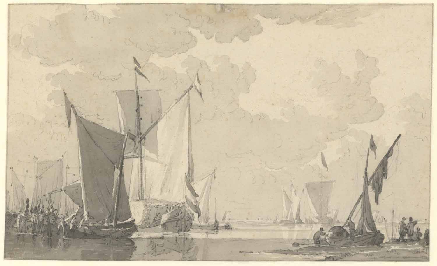 Het inkomen van twee beurtschepen in eene haven bij ...