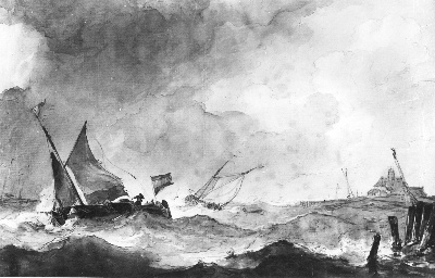 Een opkomende storm, regts bij een havenhoofd eene u...