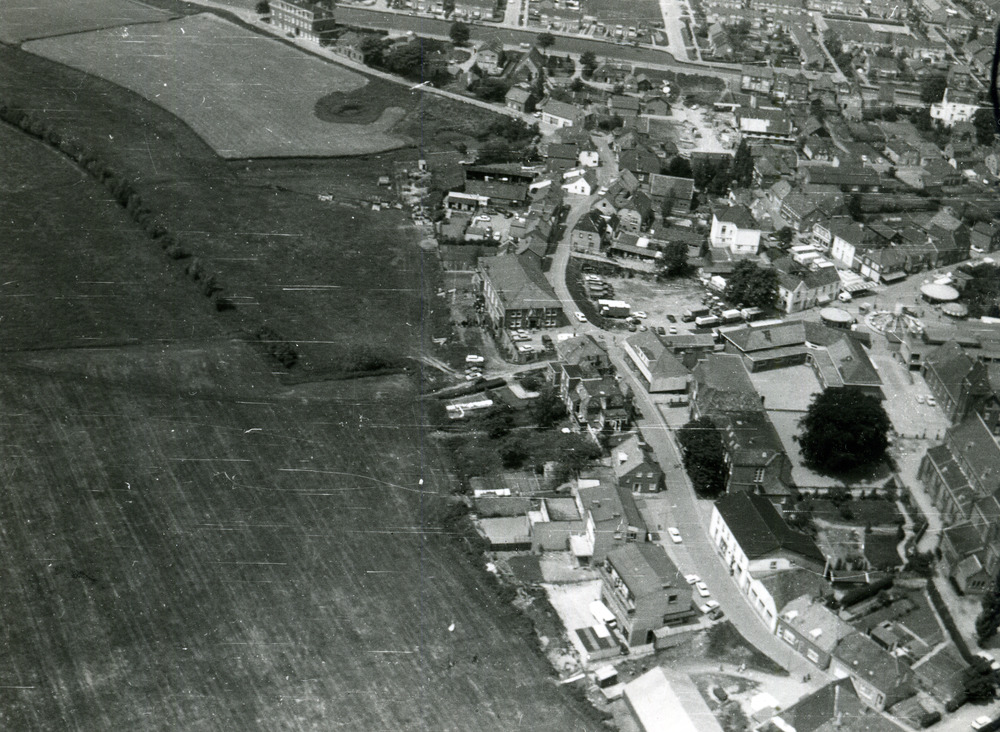Zwart-wit luchtfoto van het dorp Lobith. ca. 1960-1990.