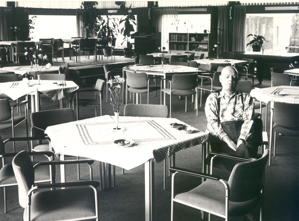 Zwart-wit foto van een bewoner in de recreatieruimte...