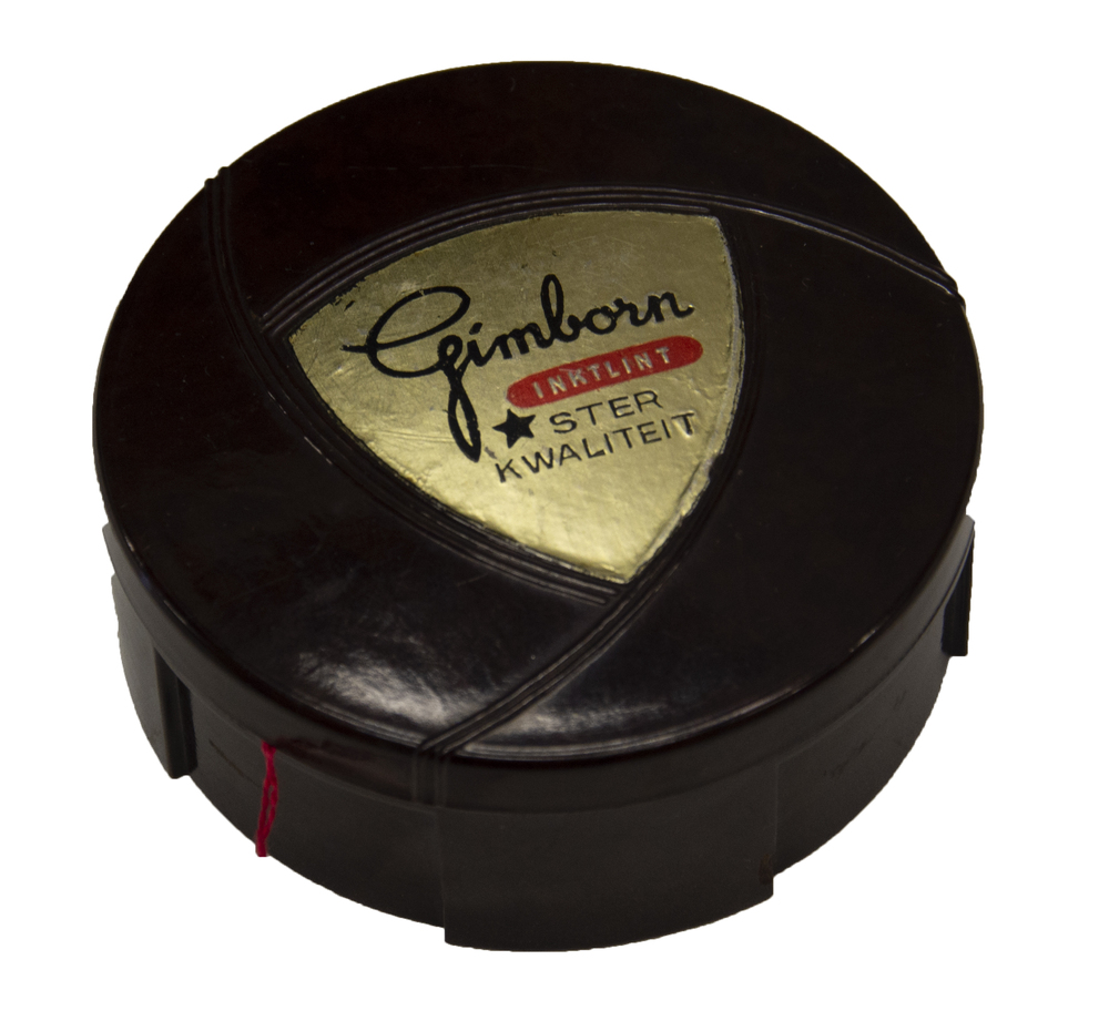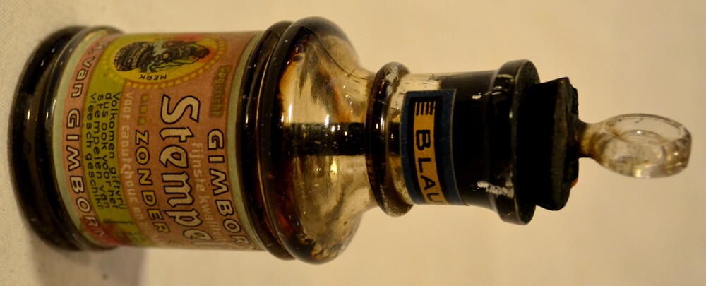 Flesje van glas gevuld met stempelinkt door H. van G...