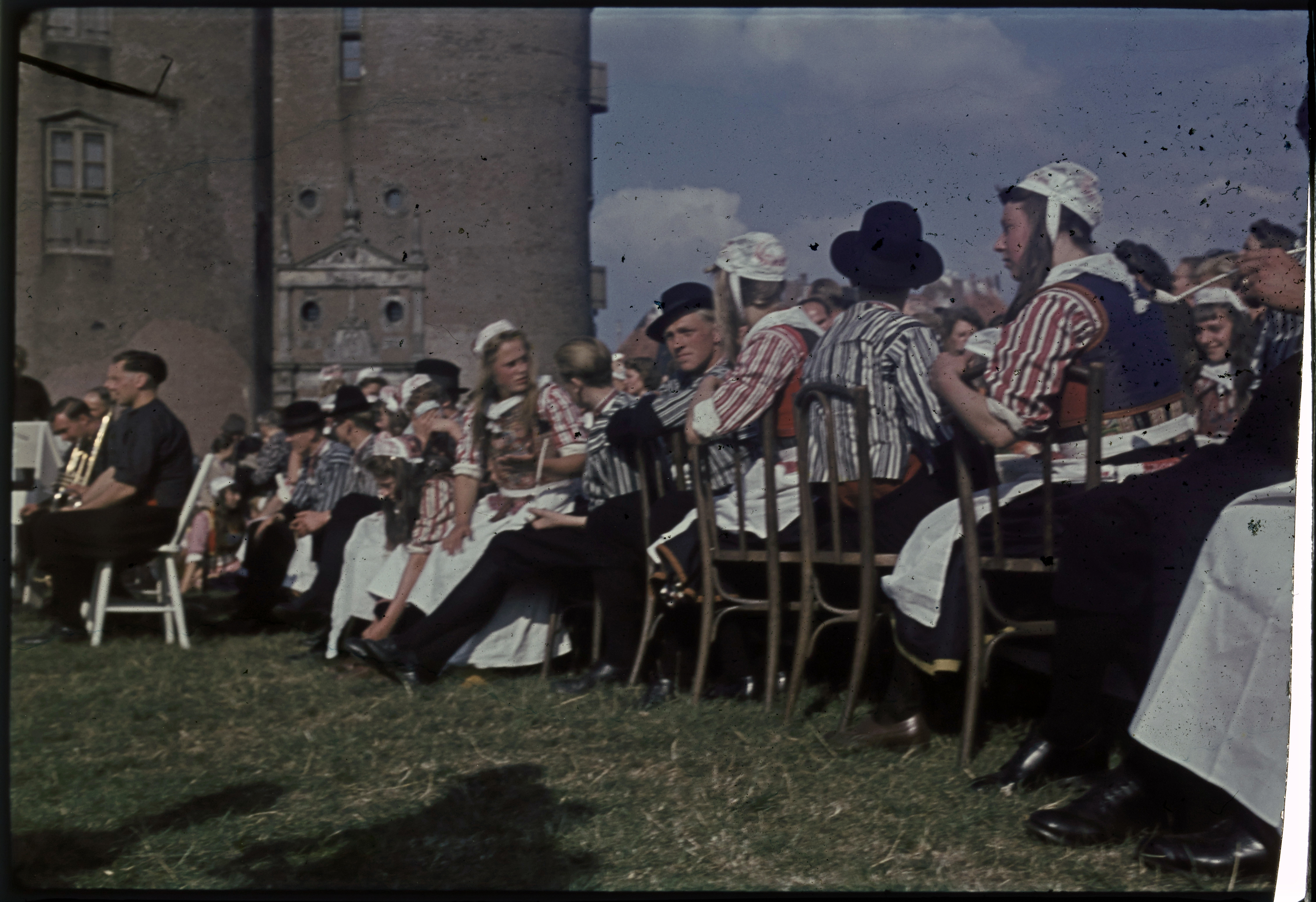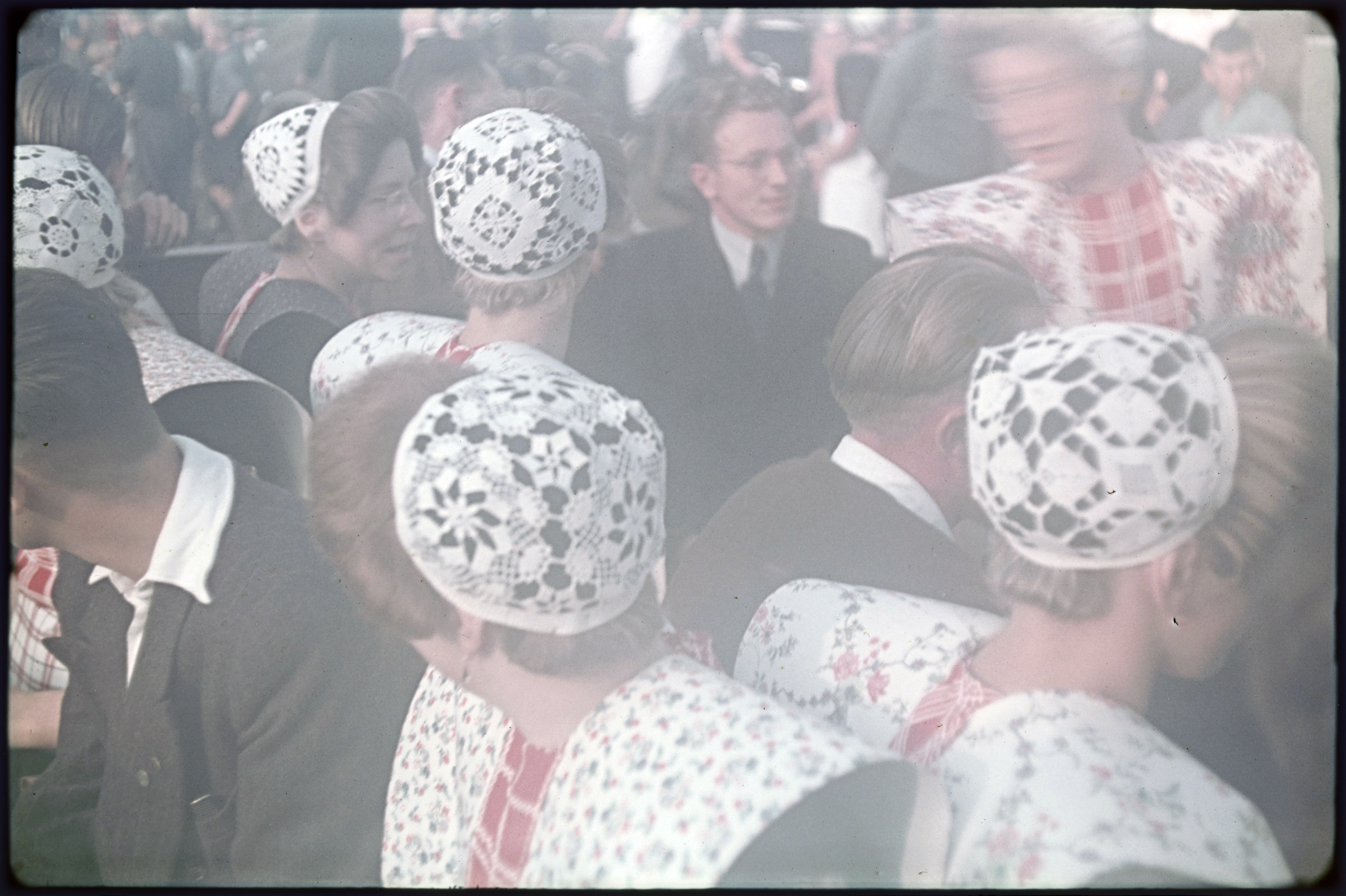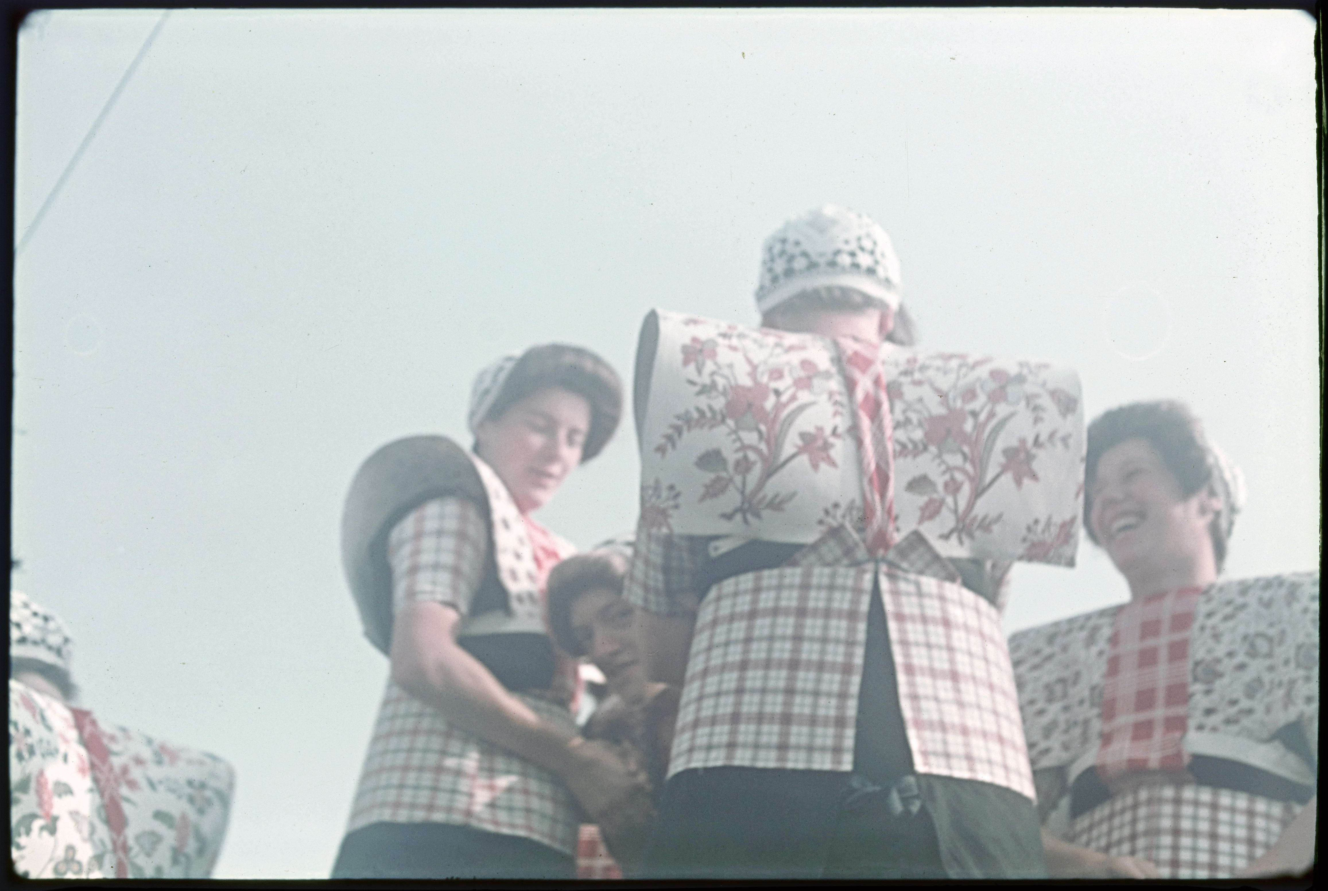 Meisjes in klederdracht met hoeden.