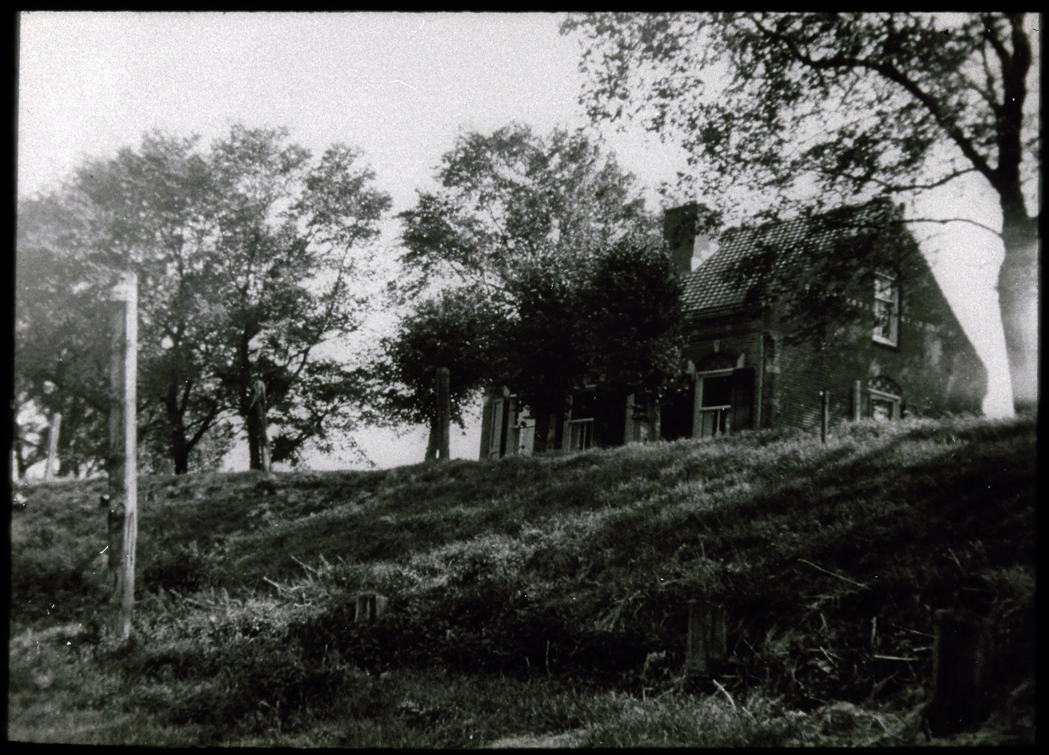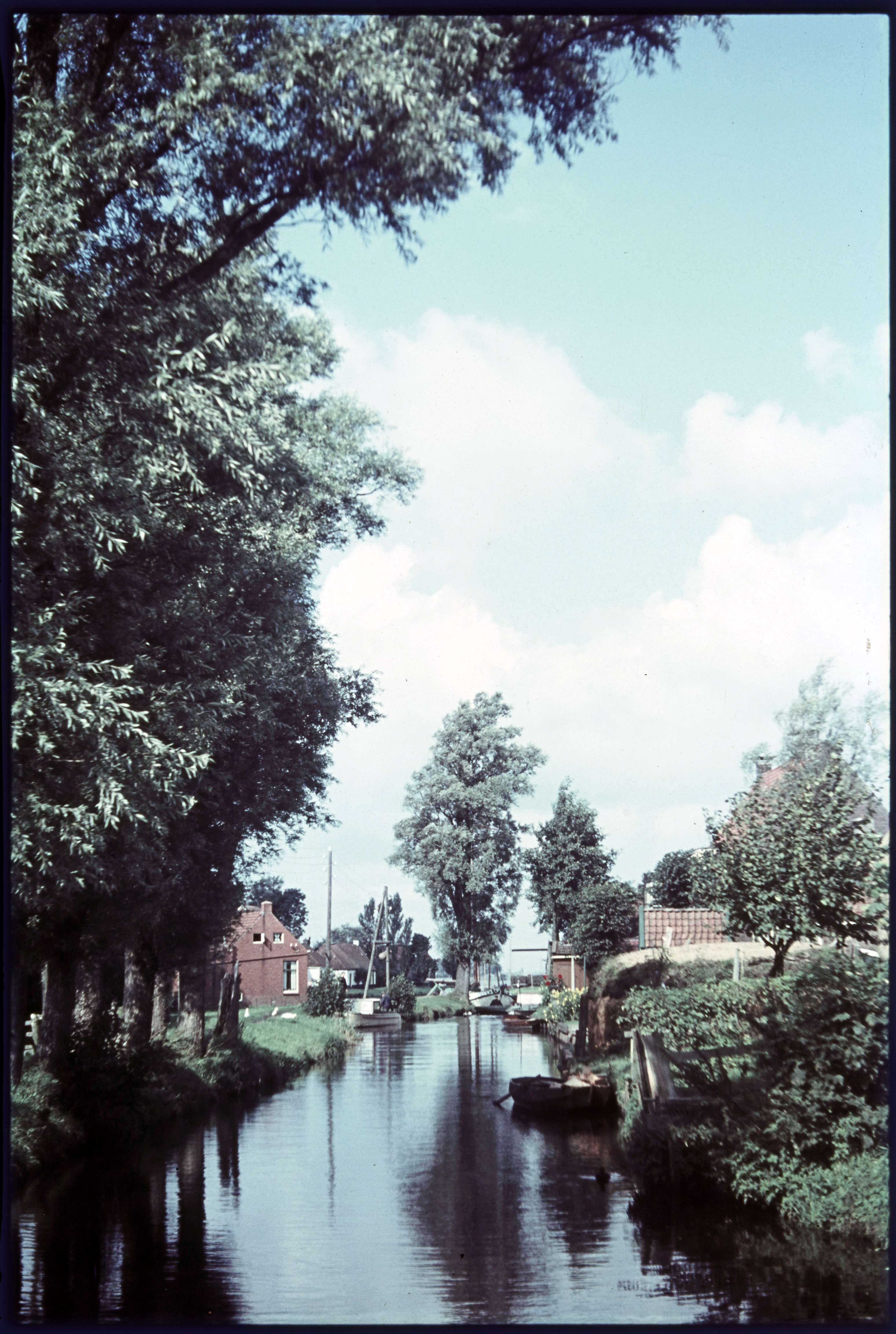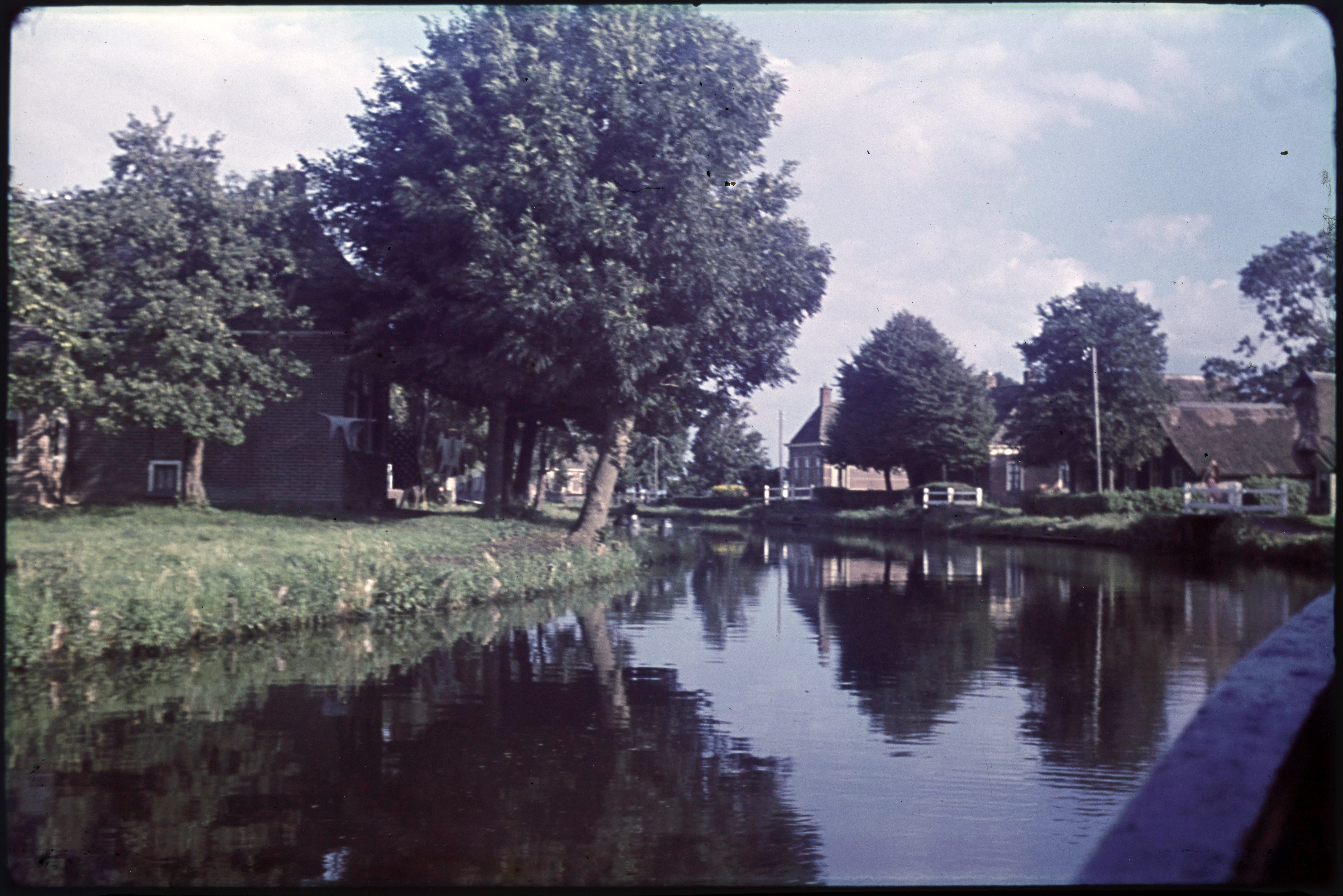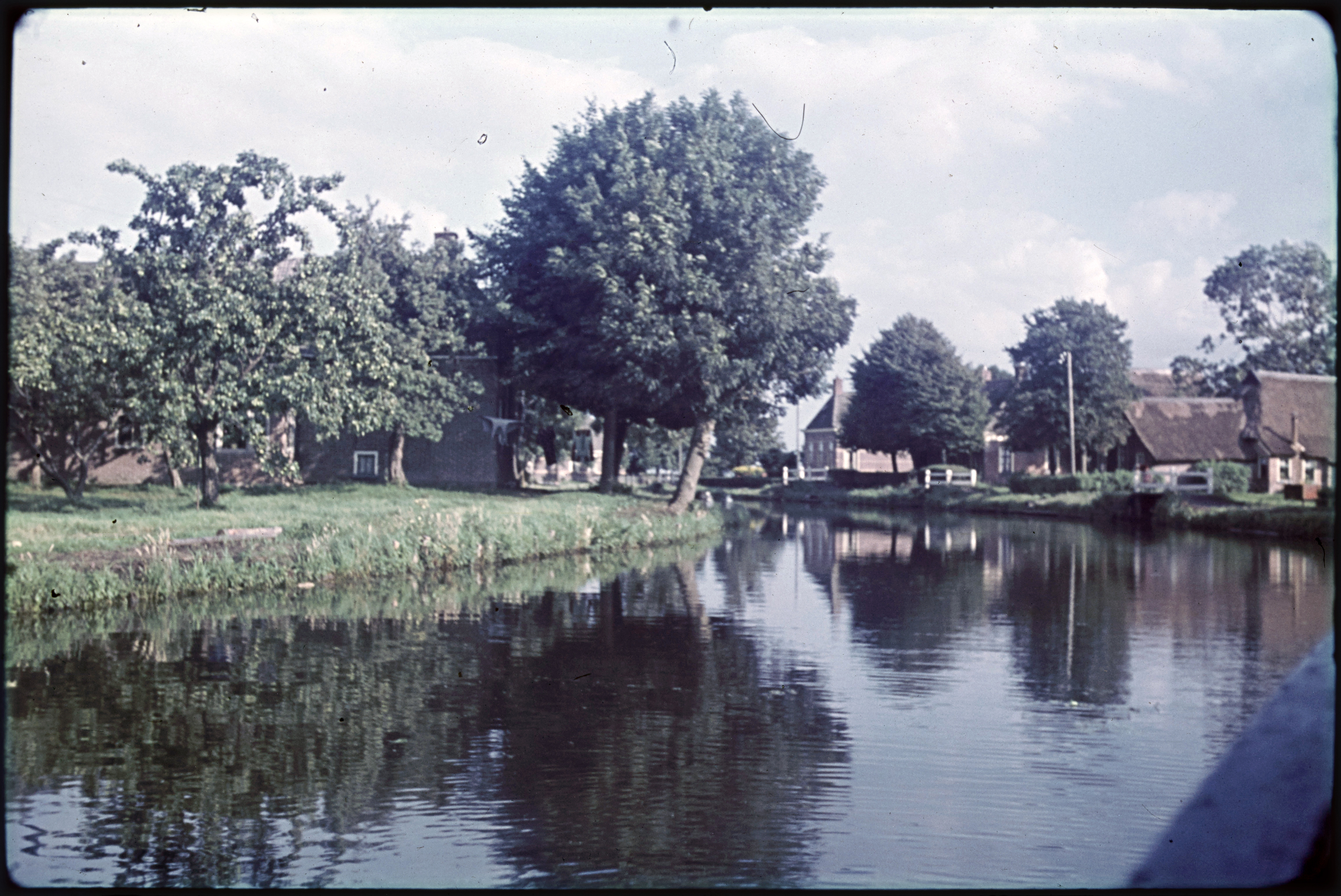 Lege vaart met huizen en boerderijen aan weerszijden...