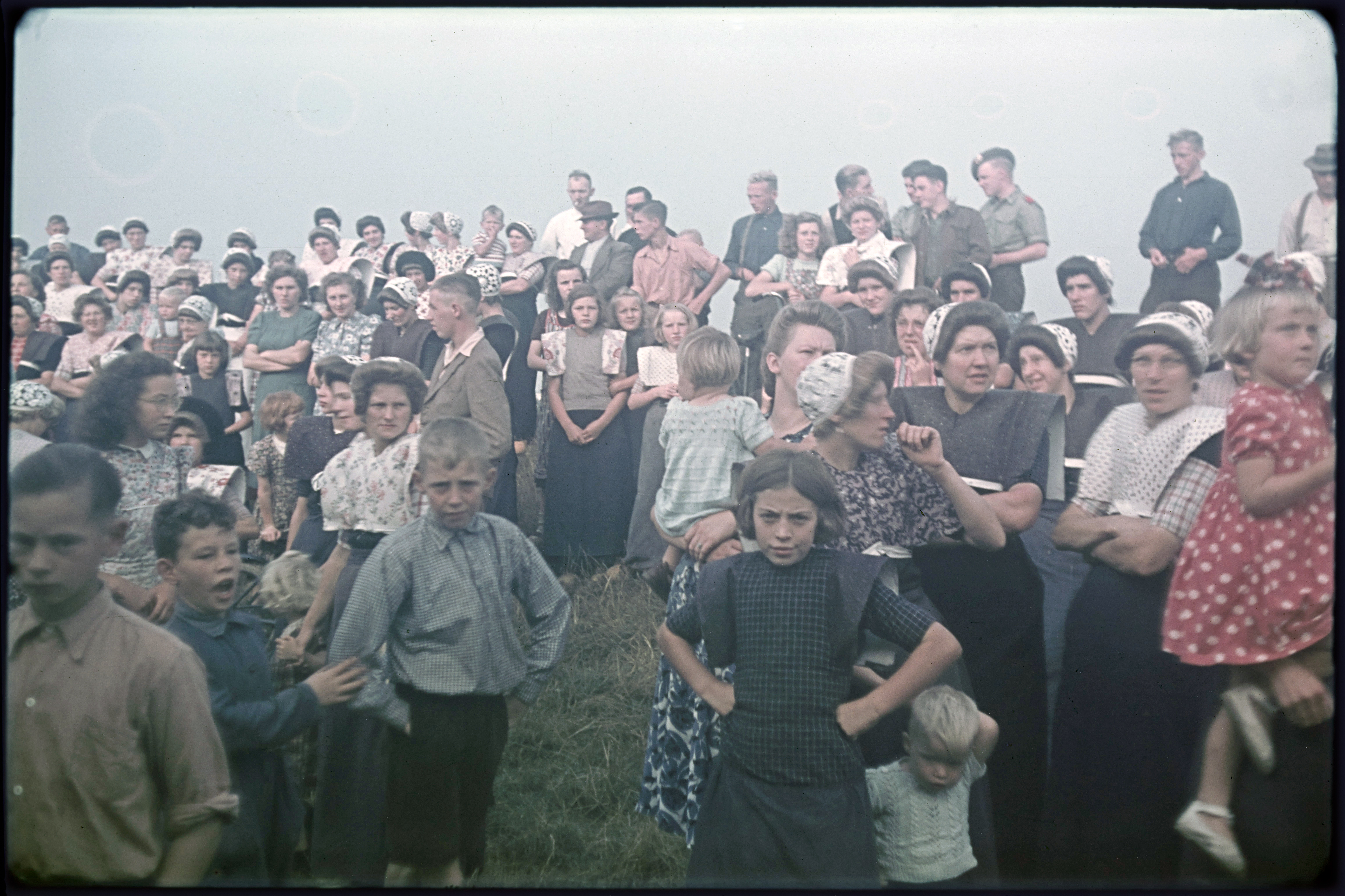 Menigte met en zonder klederdracht op straat tijdens...
