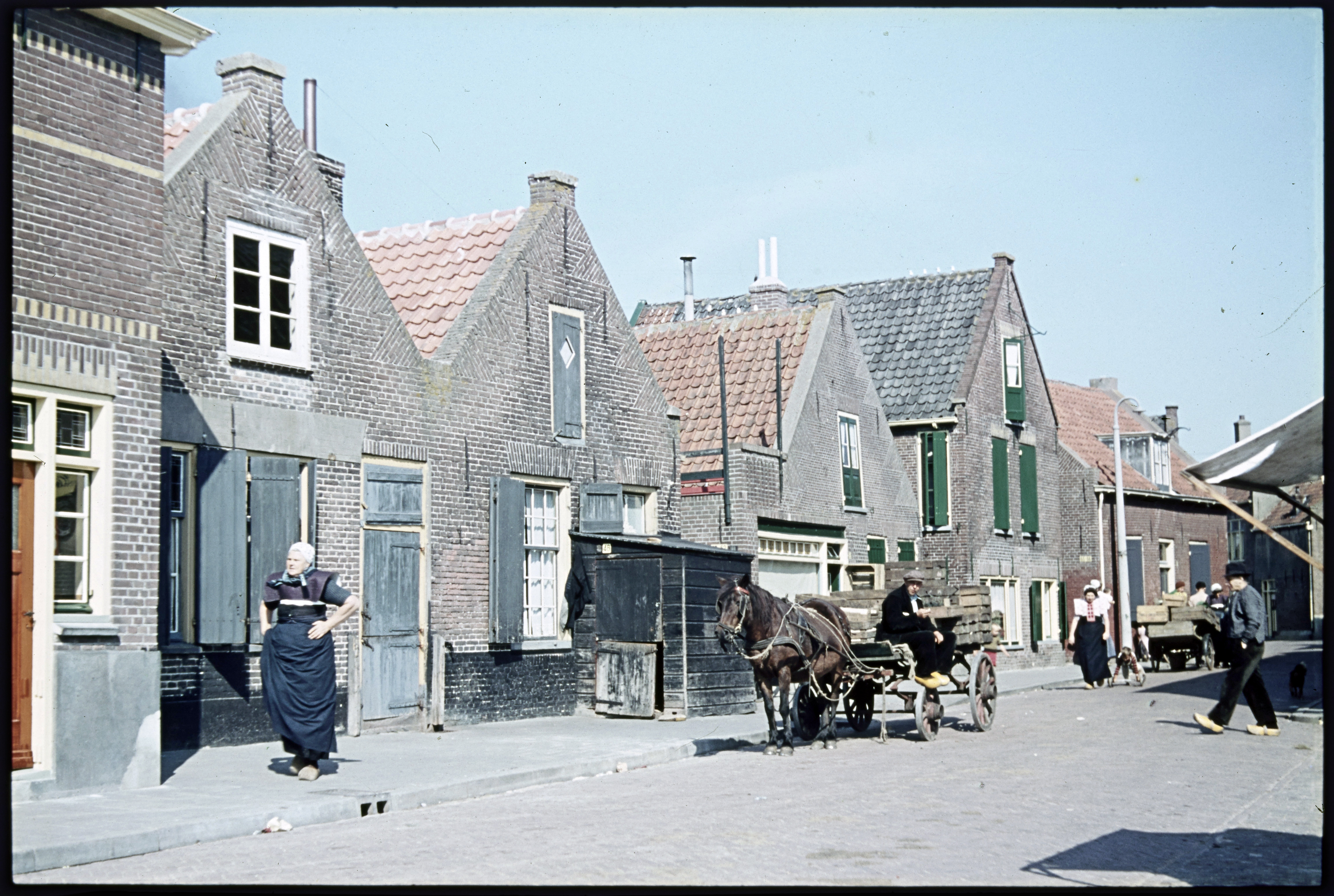 Dorpsgezicht met lopende man in klederdracht.