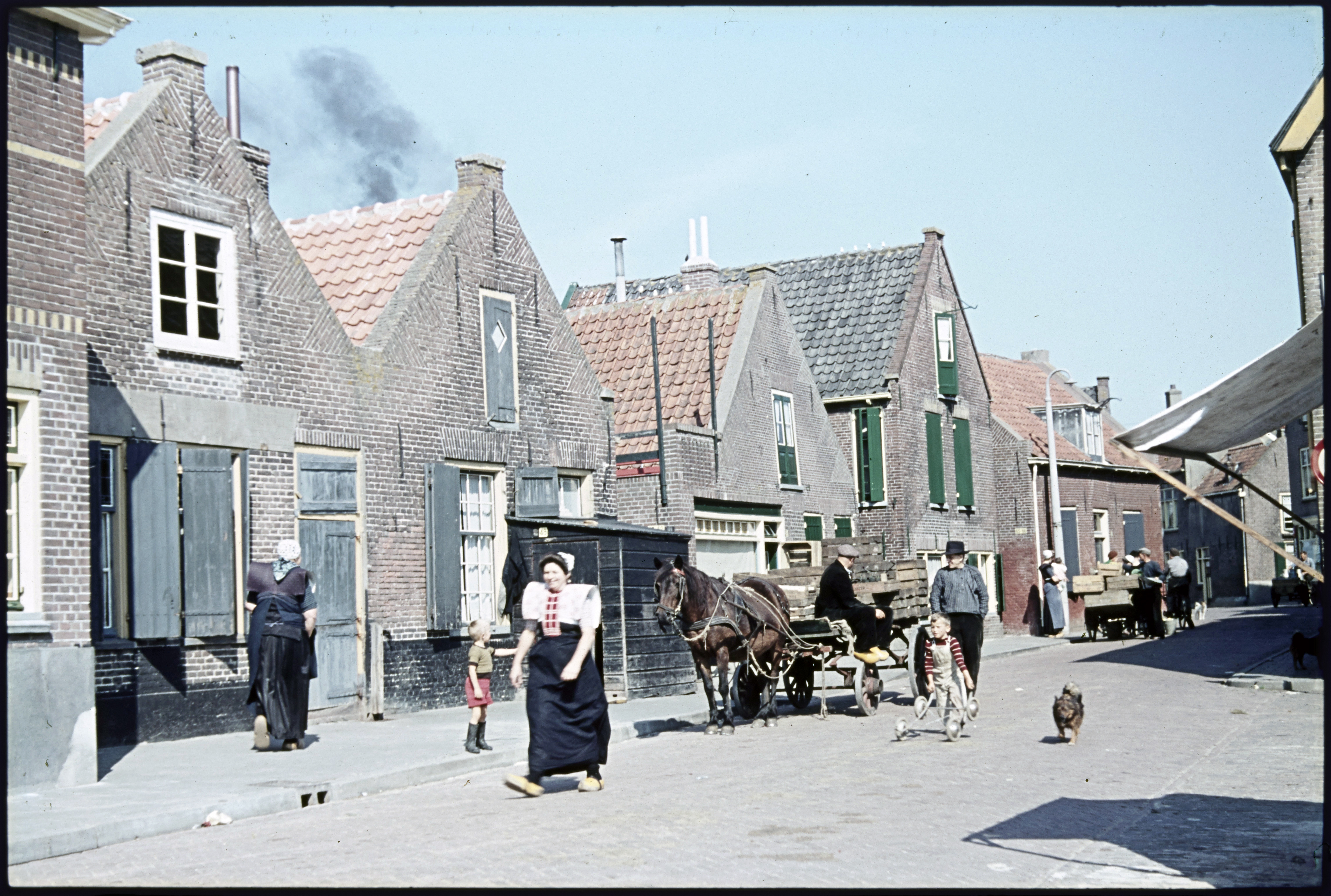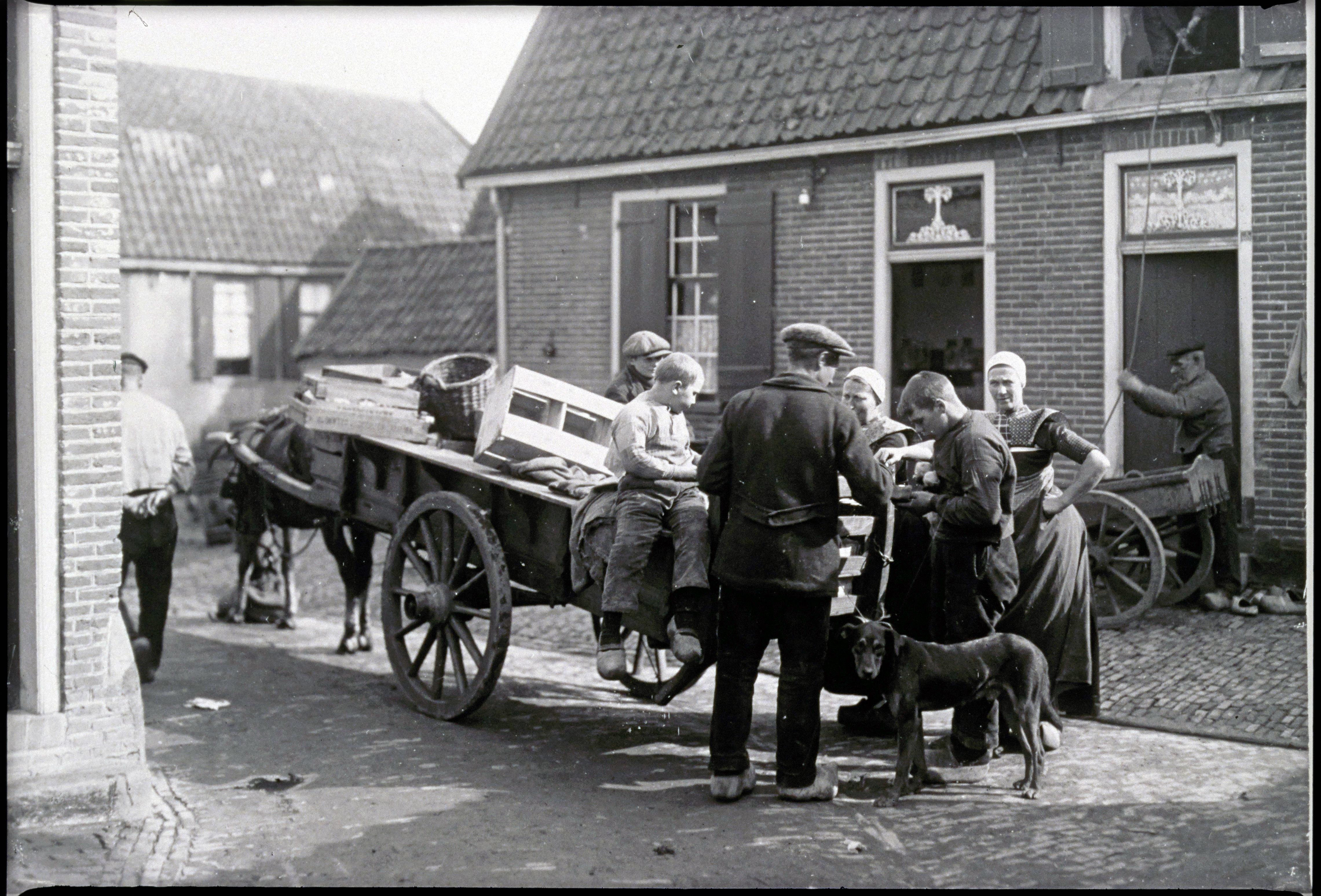Straatbeeld van dorpsbewoners met kar.