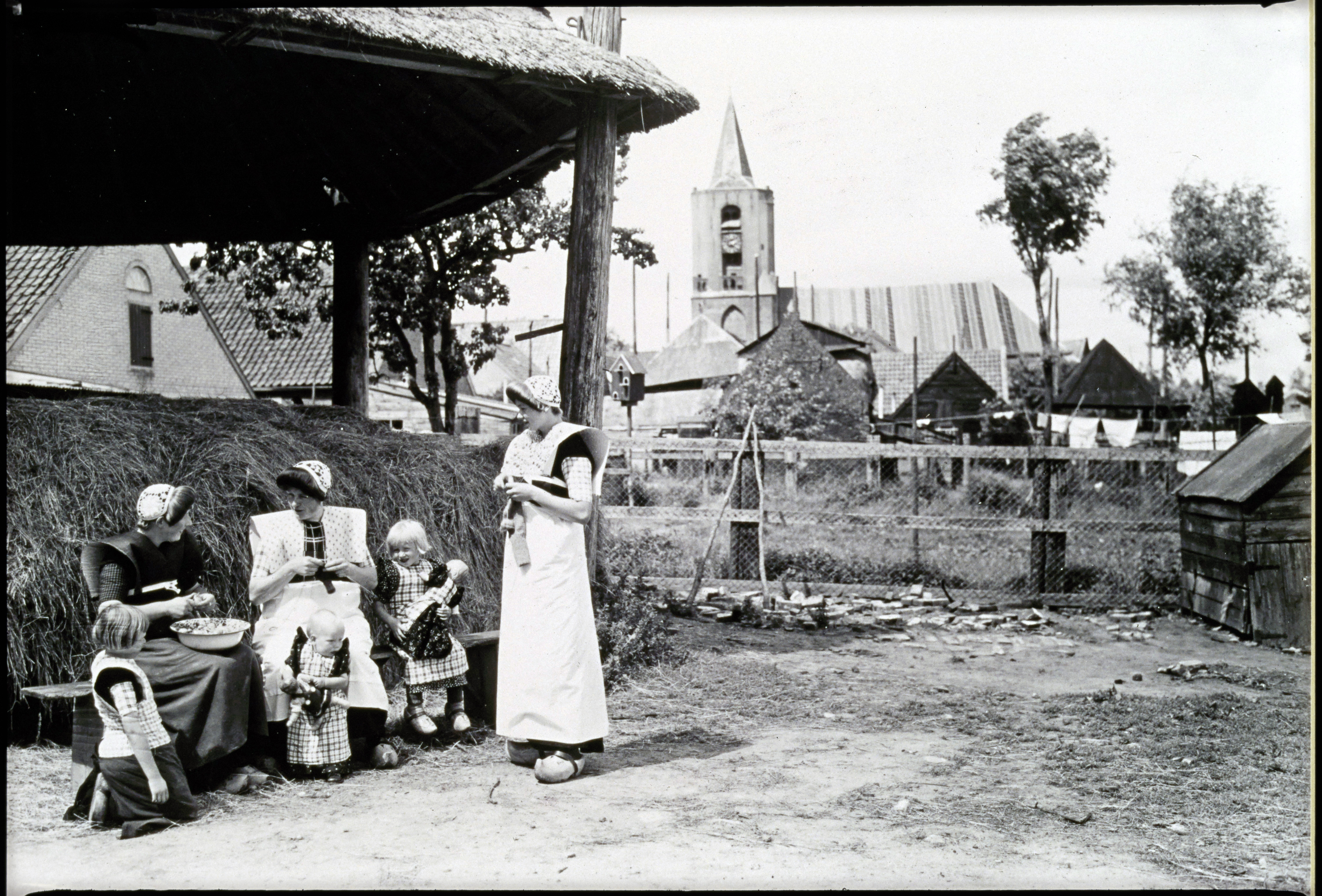 Vrouwen in klederdracht bij schuurtje met geopende h...