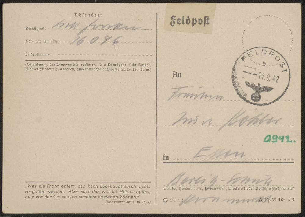 Kaart Feldpost Ogfr. W. Joosten 11.9.'42