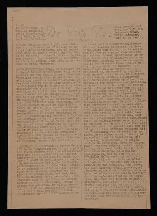 "De Vrije Pers", getypte circulaire van vlak na de b...