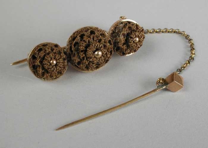 Gouden broche met sierspeld aan kettinkje, en drie g...