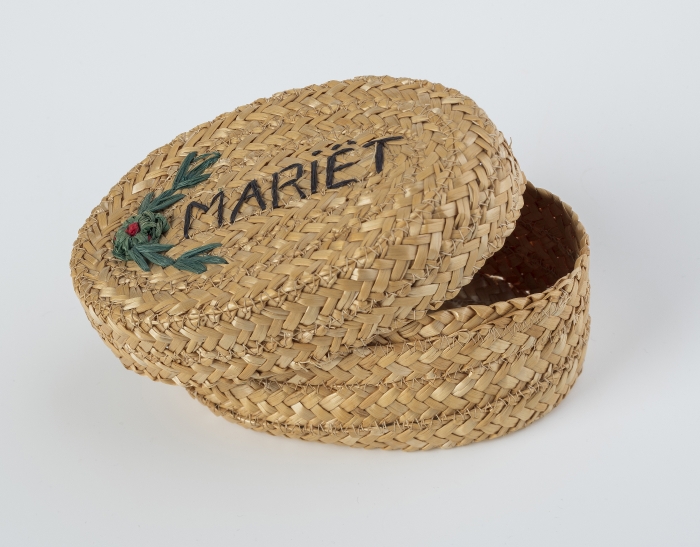Ovaal doosje van naturel bandstro, met op de deksel ...