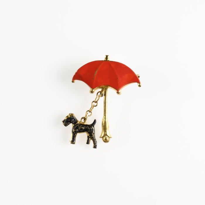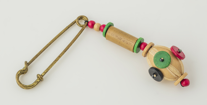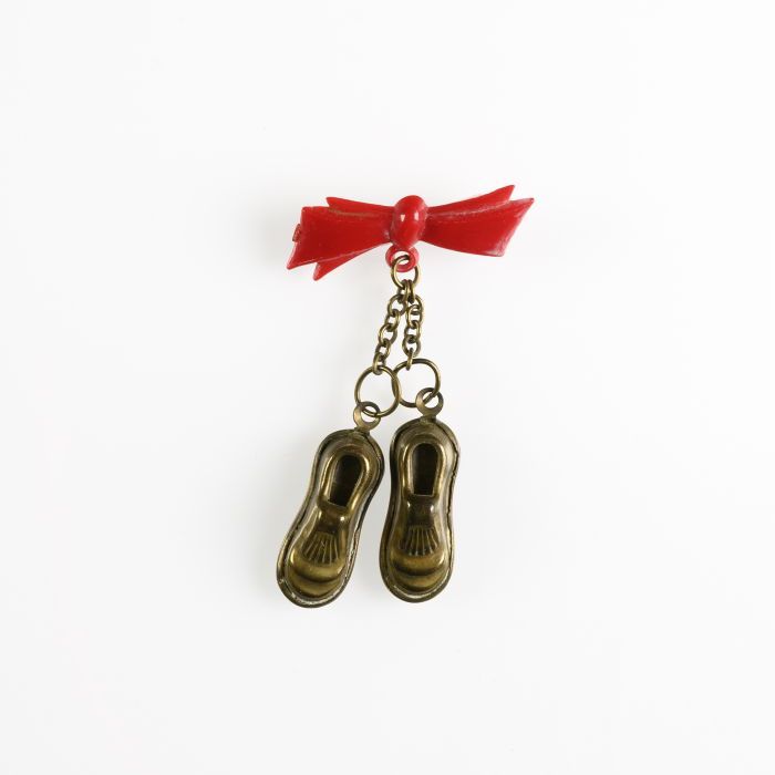 Kinderbroche, rood plastic strikje, waaraan met scha...