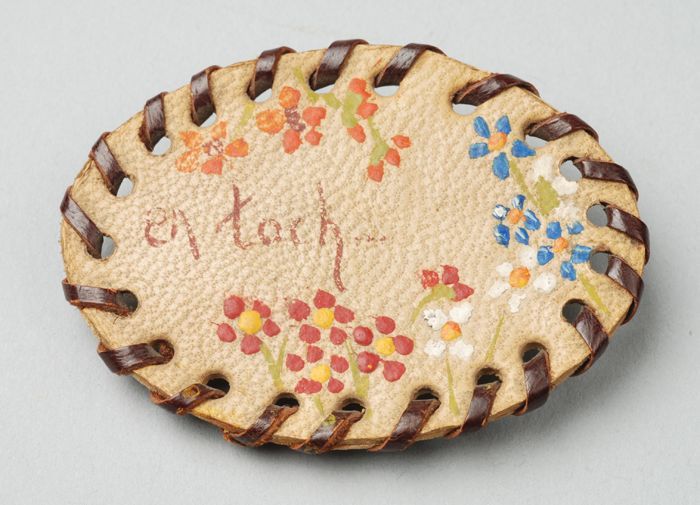 Koperen kinderbroche, waaraan leren riempje en leren...