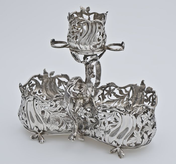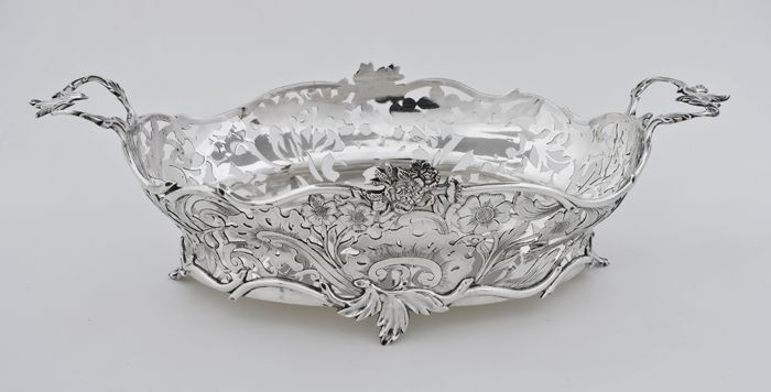 Zilveren, ovale broodmand met opengewerkte wanden ge...