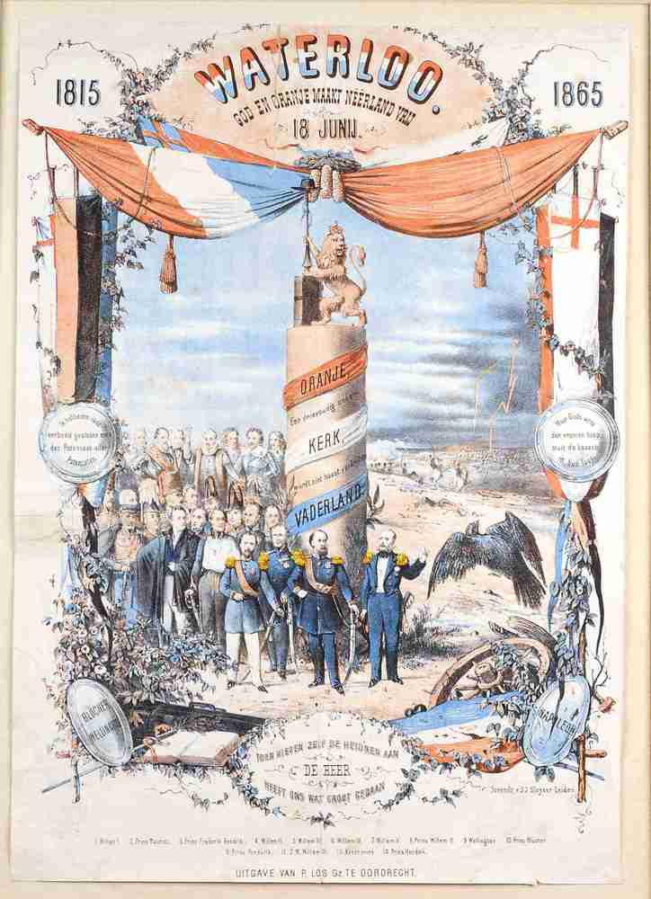 Herdenking Waterloo 1815-1865, gekleurde plaat met v...