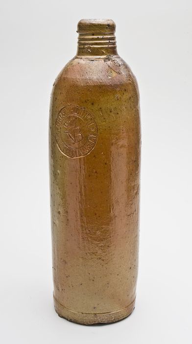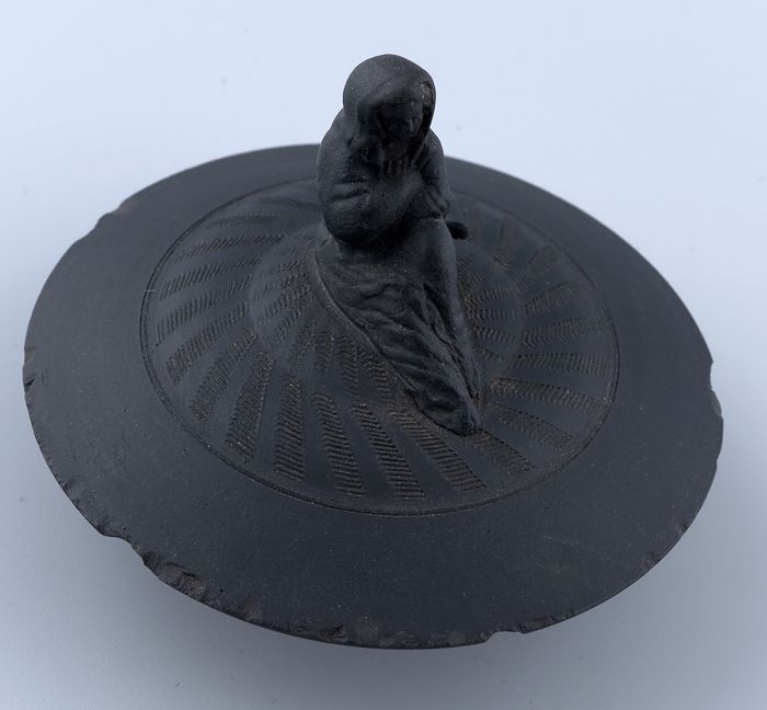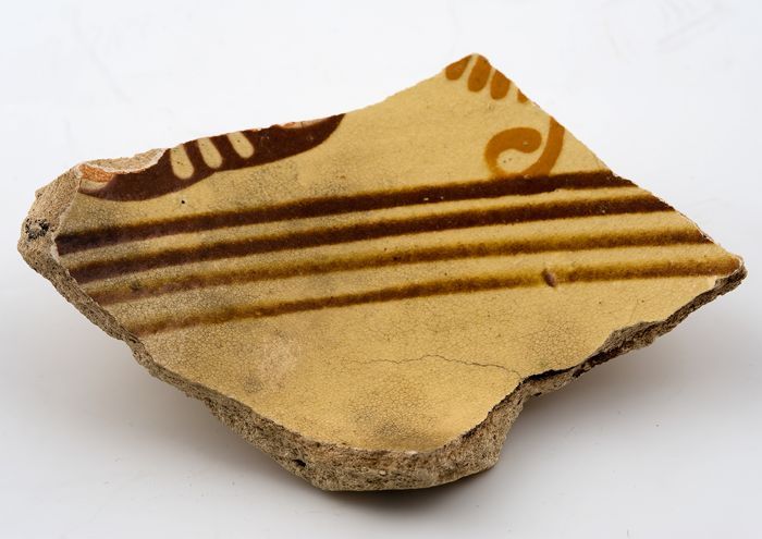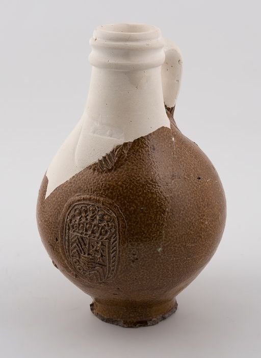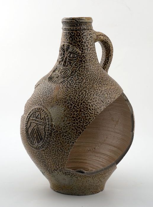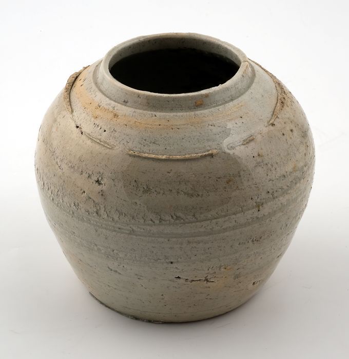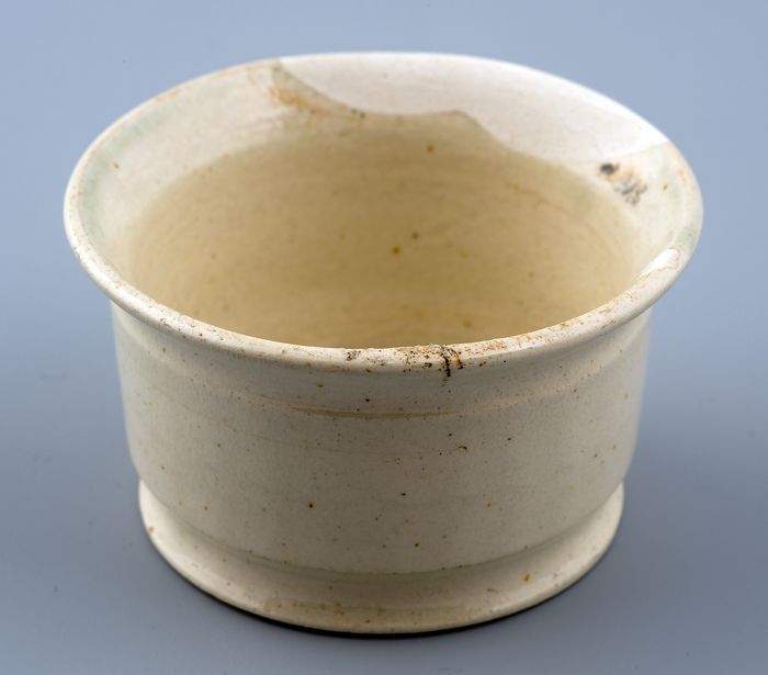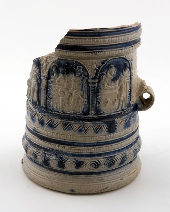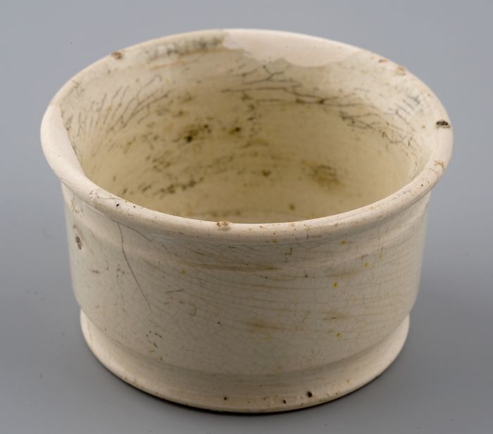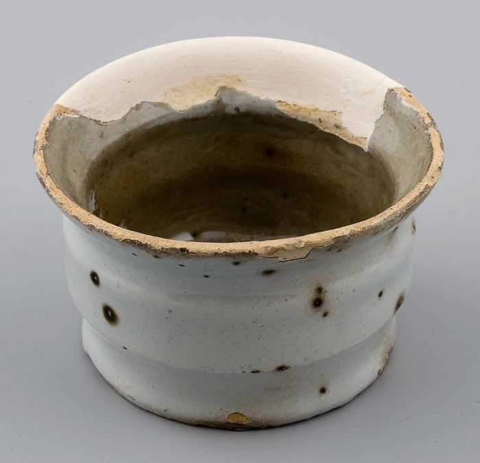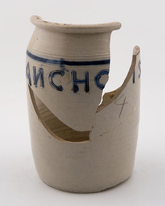 Grijs fragment van steengoed voorraadpot voor ansjovis