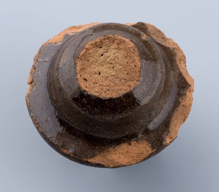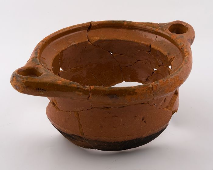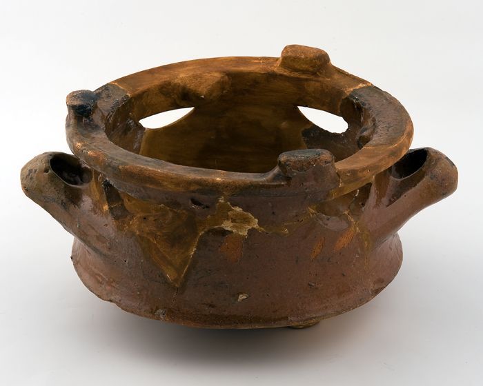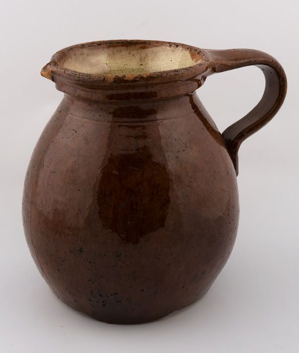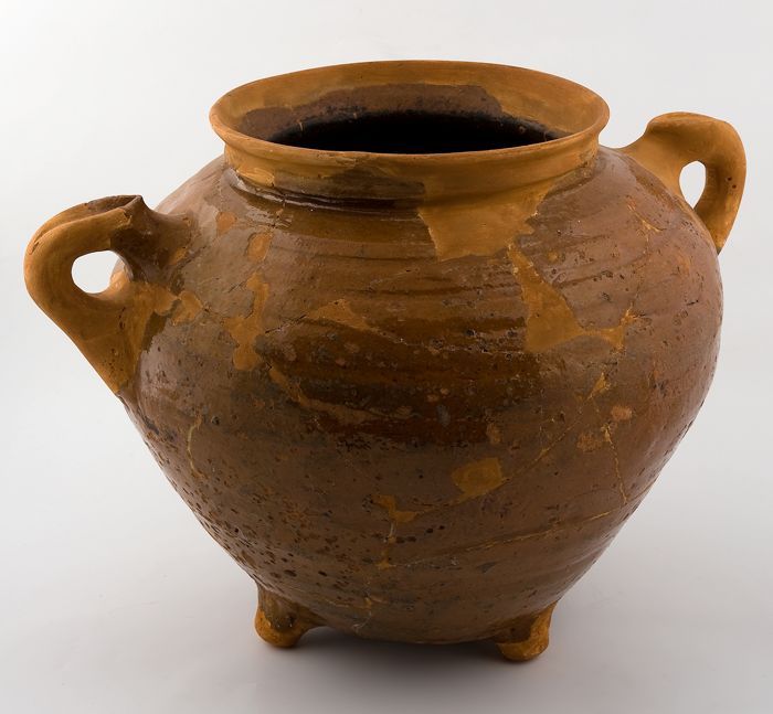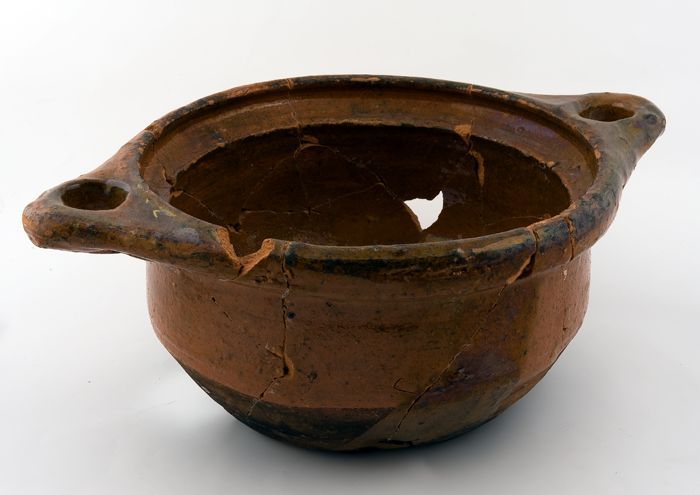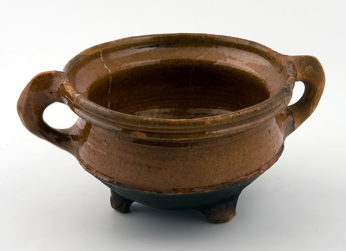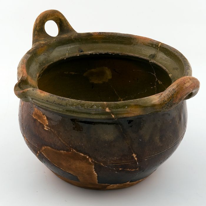 Aardewerk kookpot, bruin geglazuurd, twee omhoog geb...