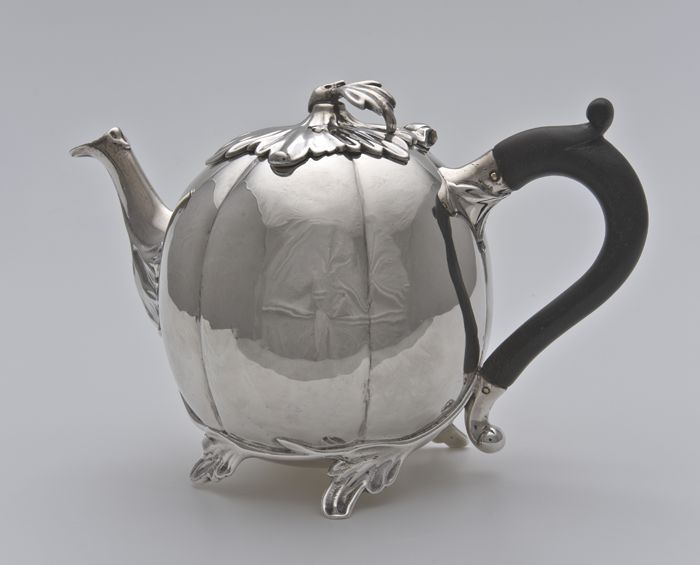 Kleine zilveren theepot met houten handvat, waarbij ...
