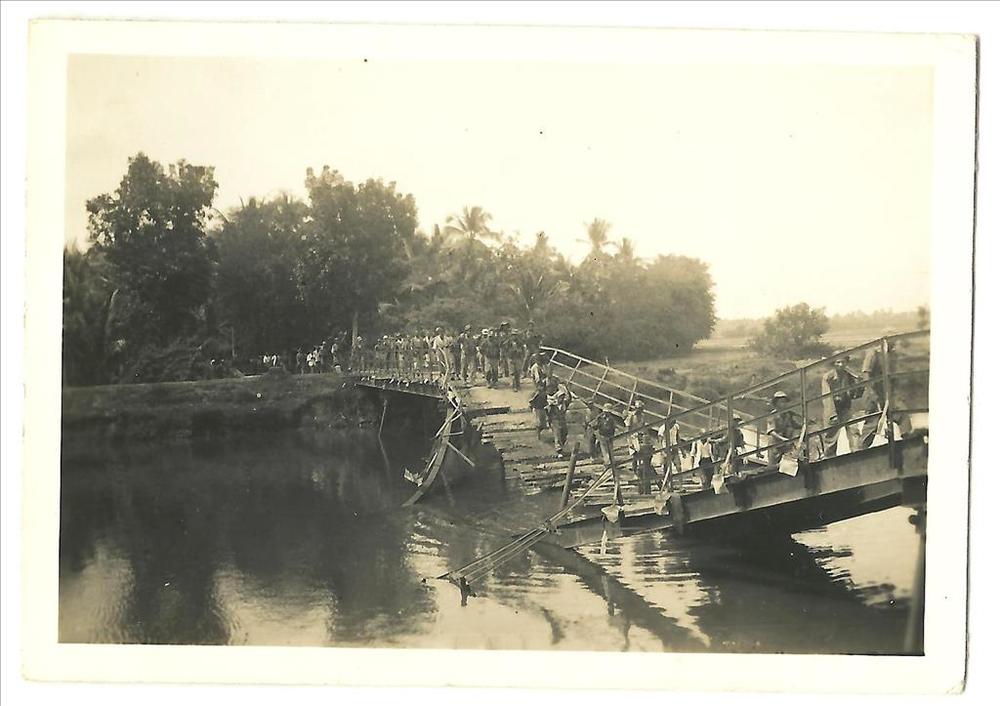 Lange stoet Indonesische soldaten op houten brug, lo...