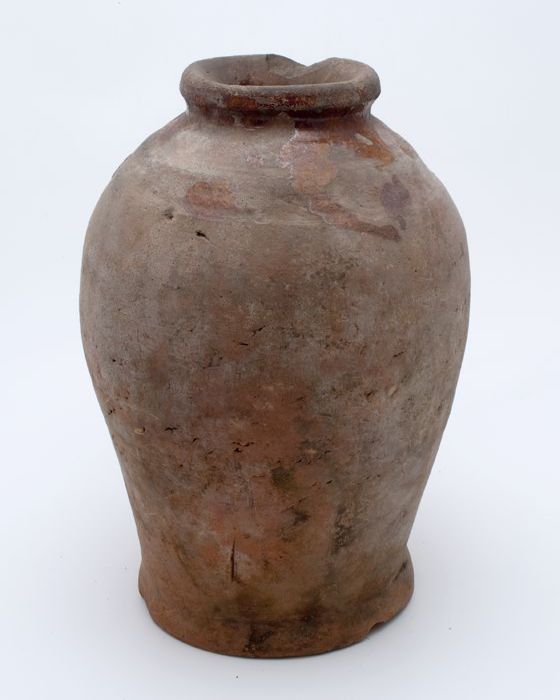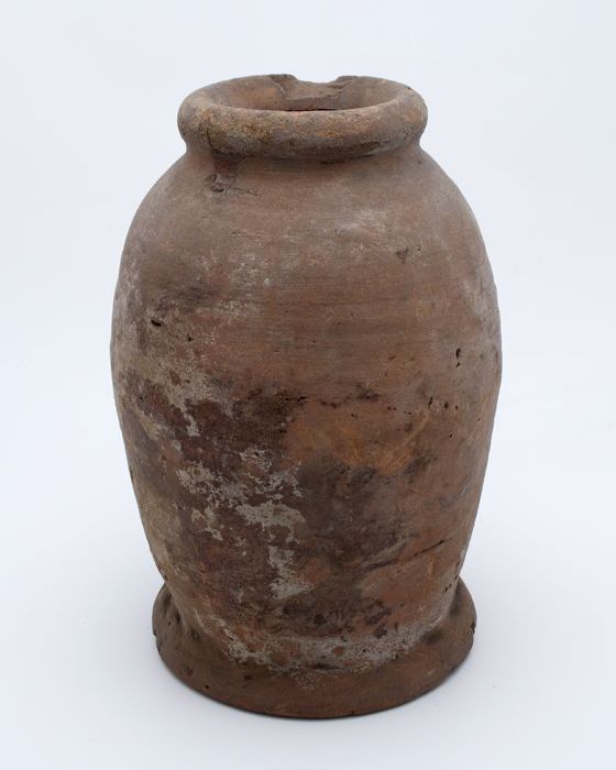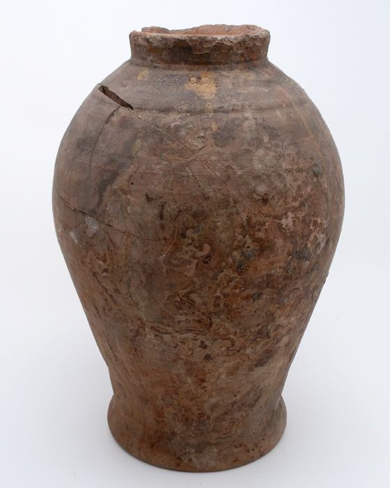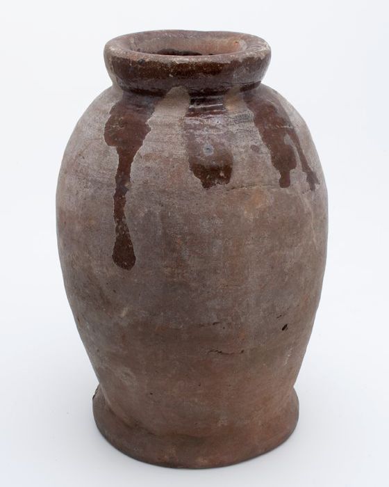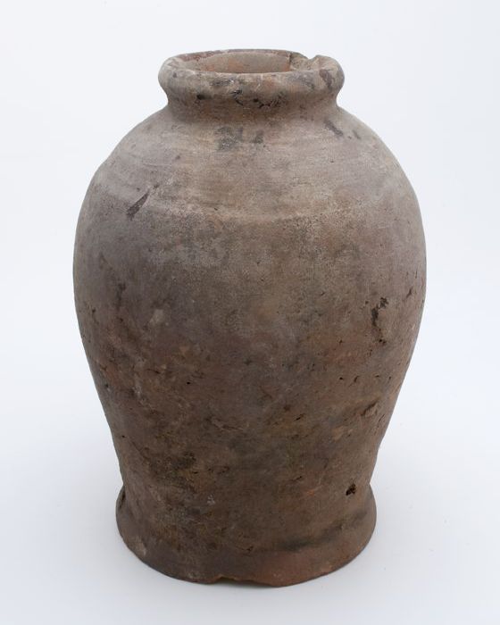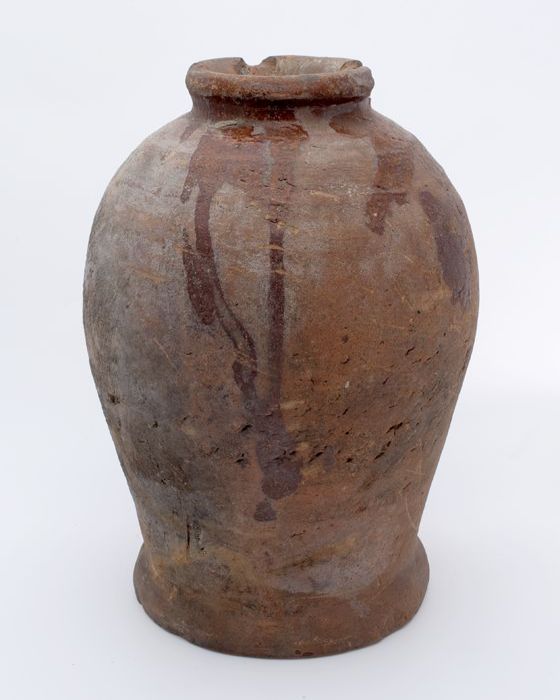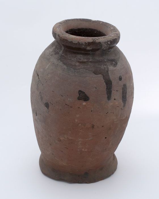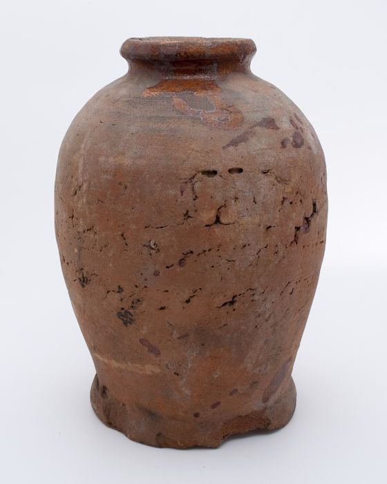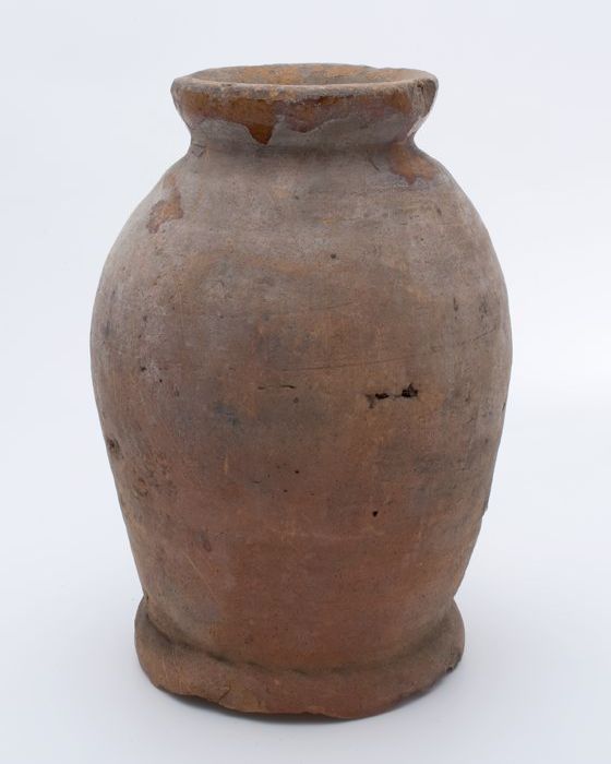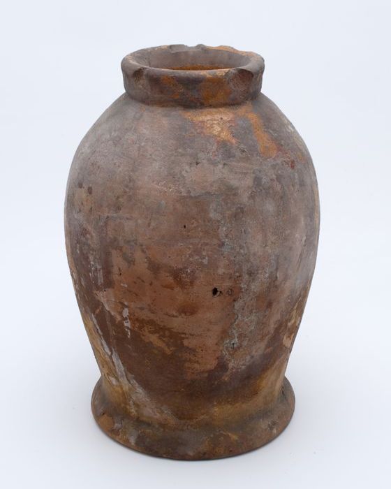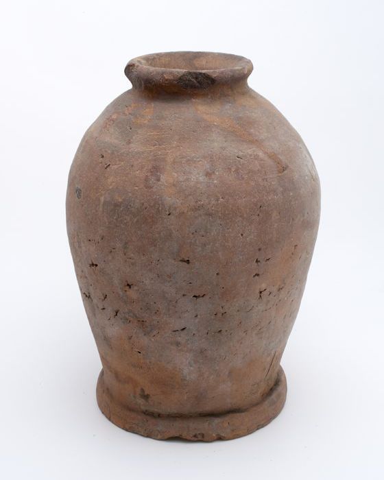 Aardewerk voorraadpot op standring, eivormig, korte ...