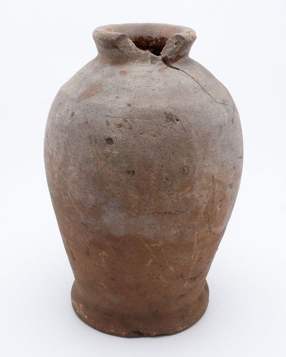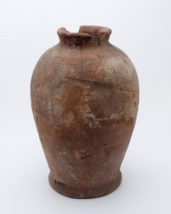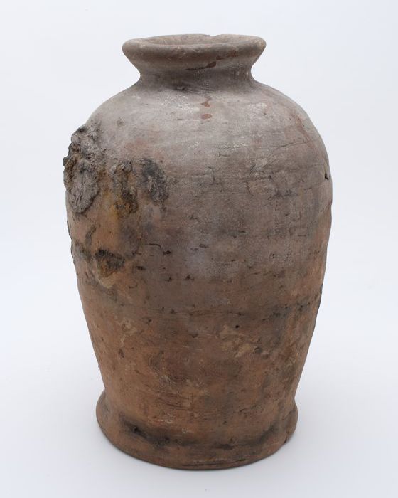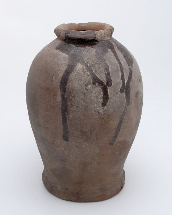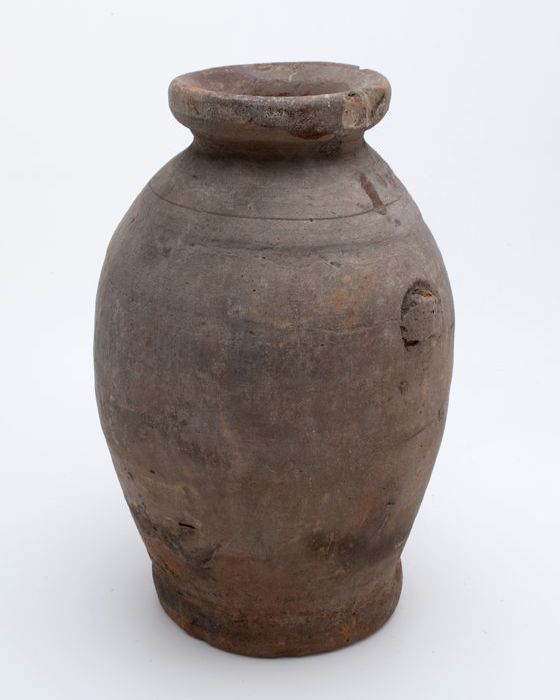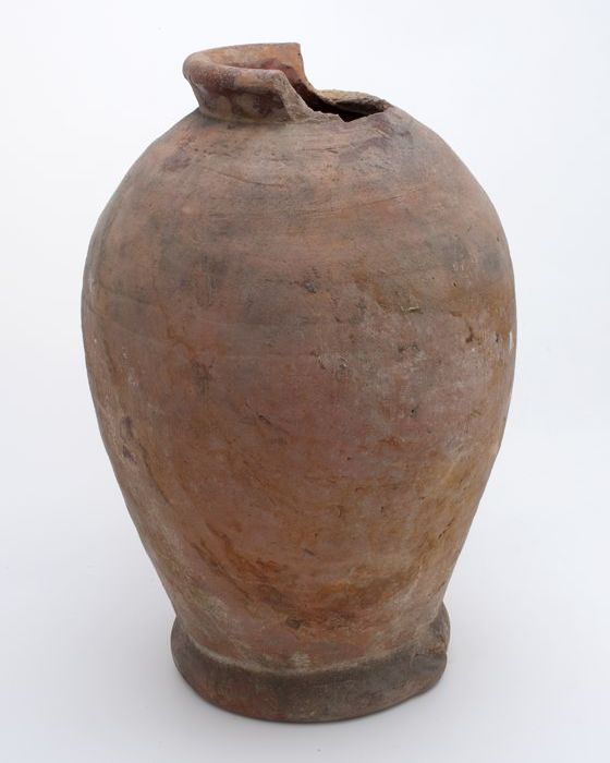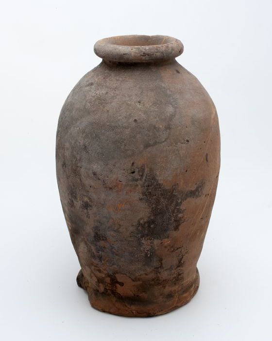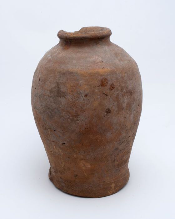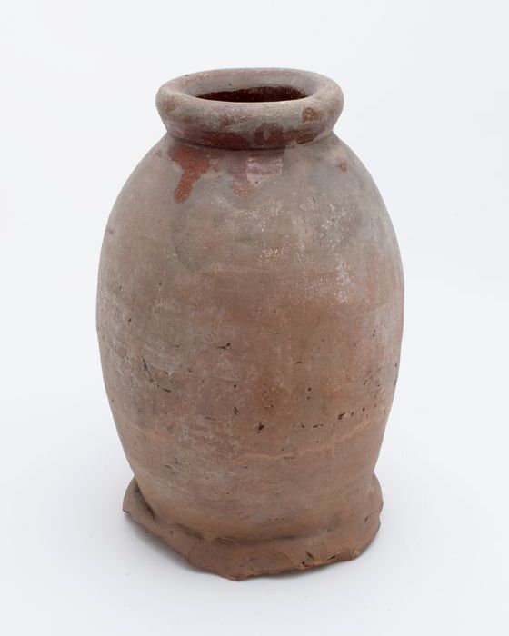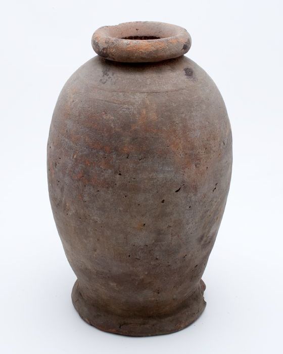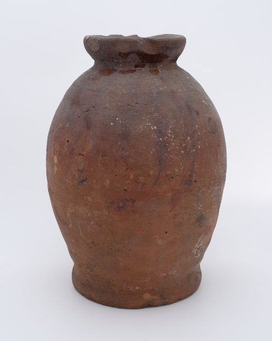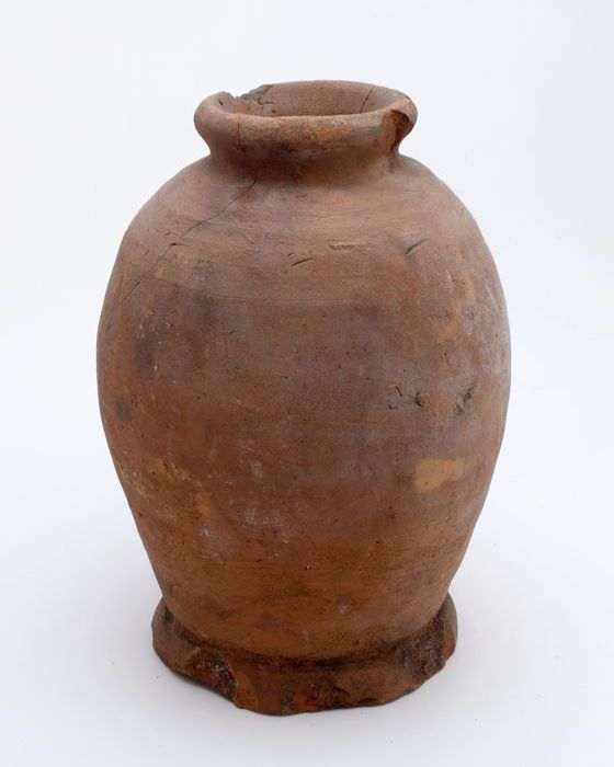 Aardewerk voorraadpot op standring, eivormig, korte ...