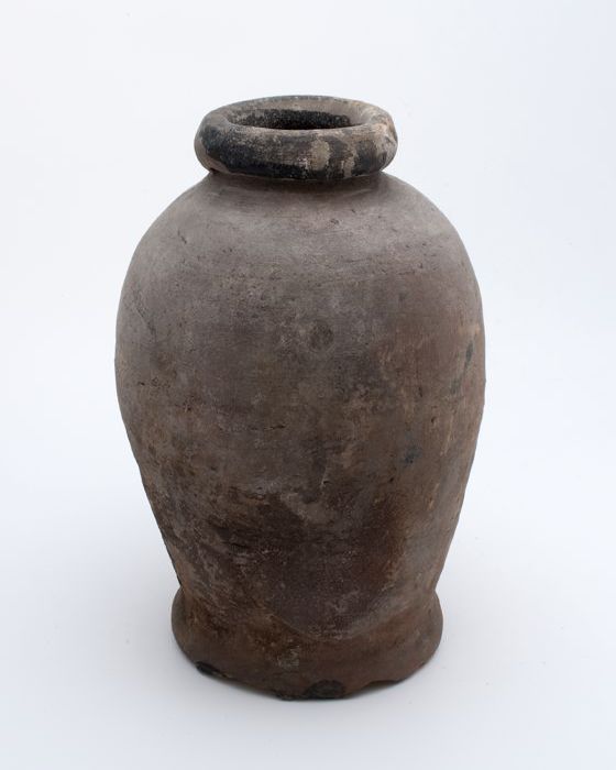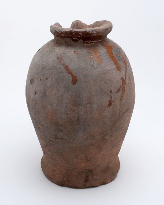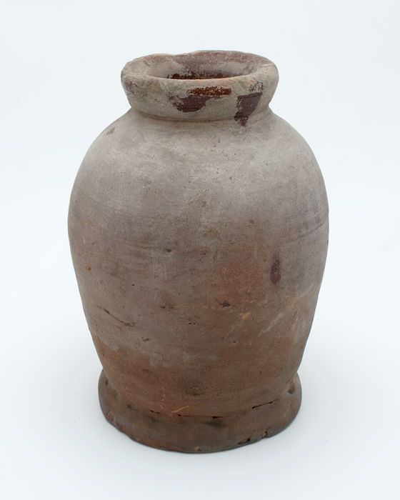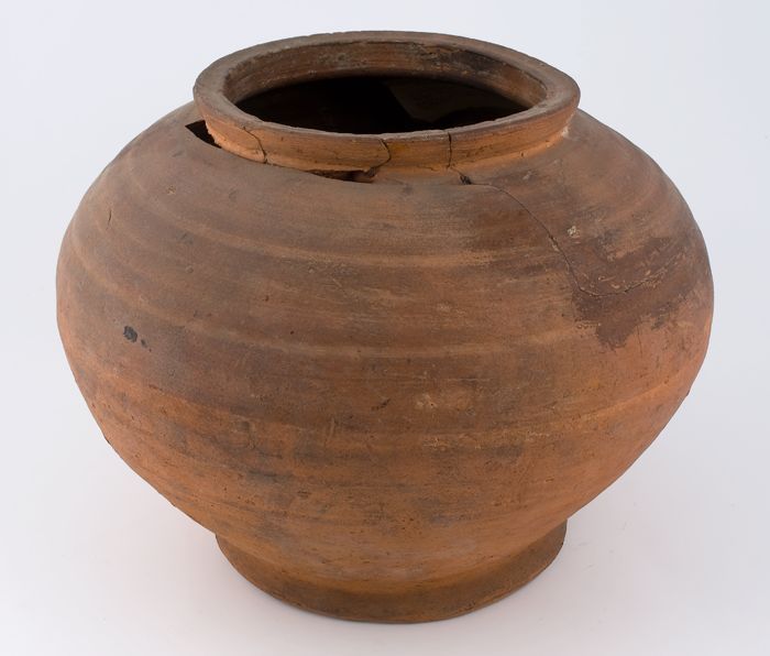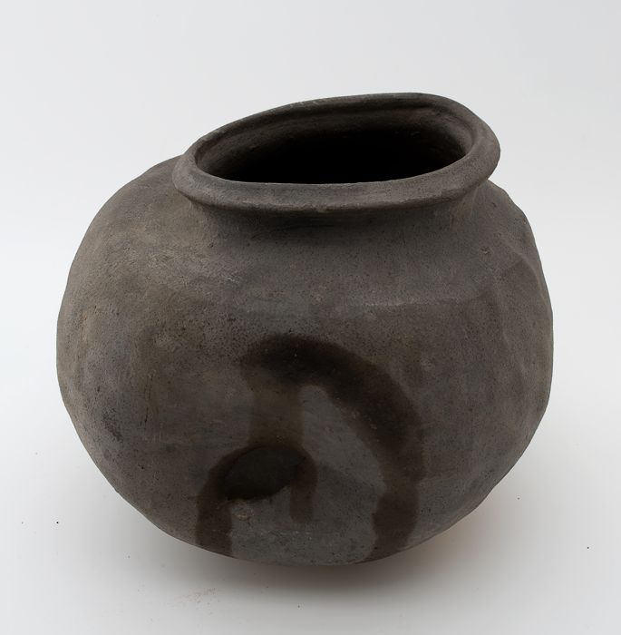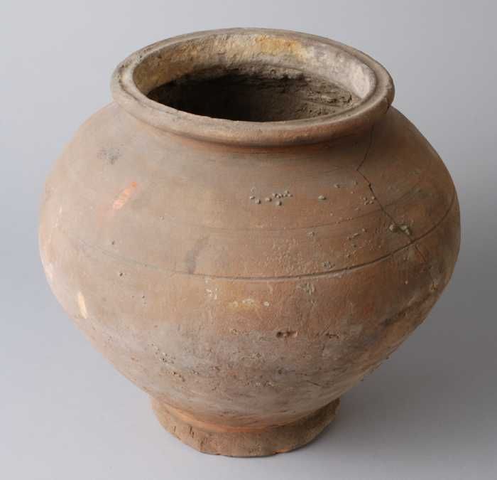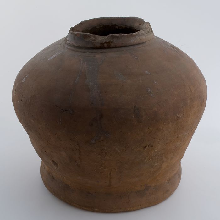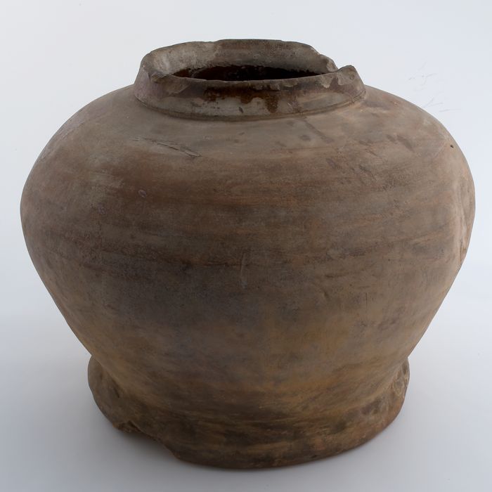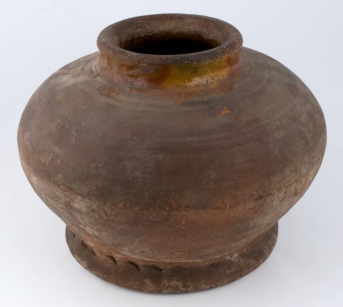 Zware aardewerk pot op wijde standring, gedrongen ei...