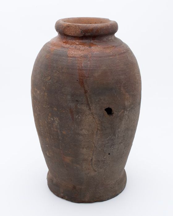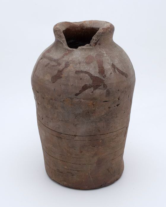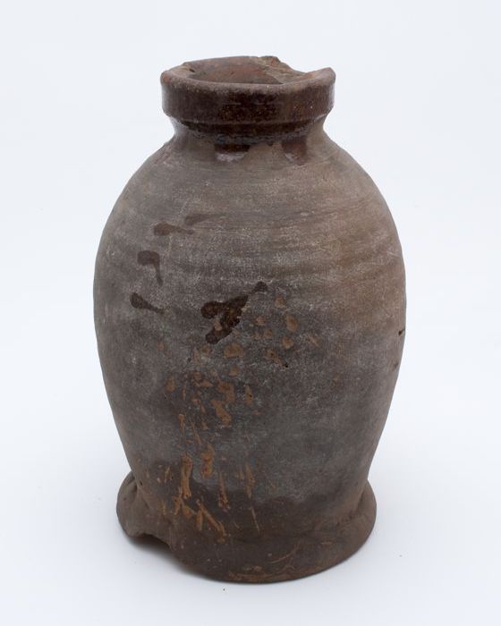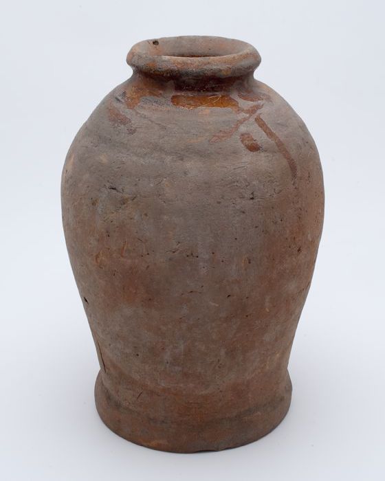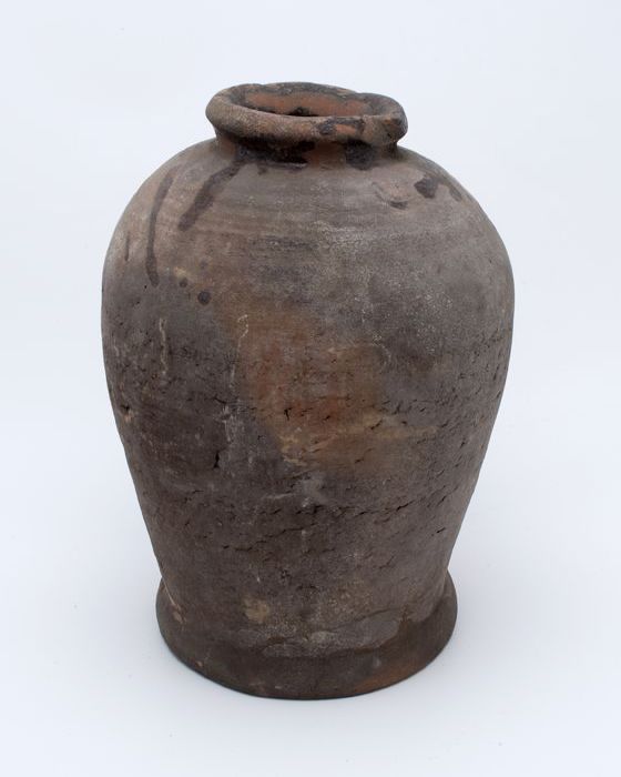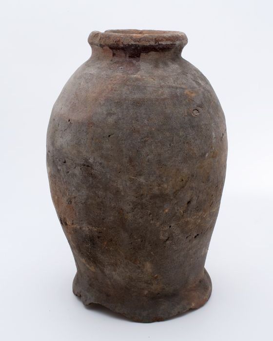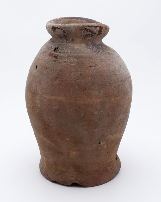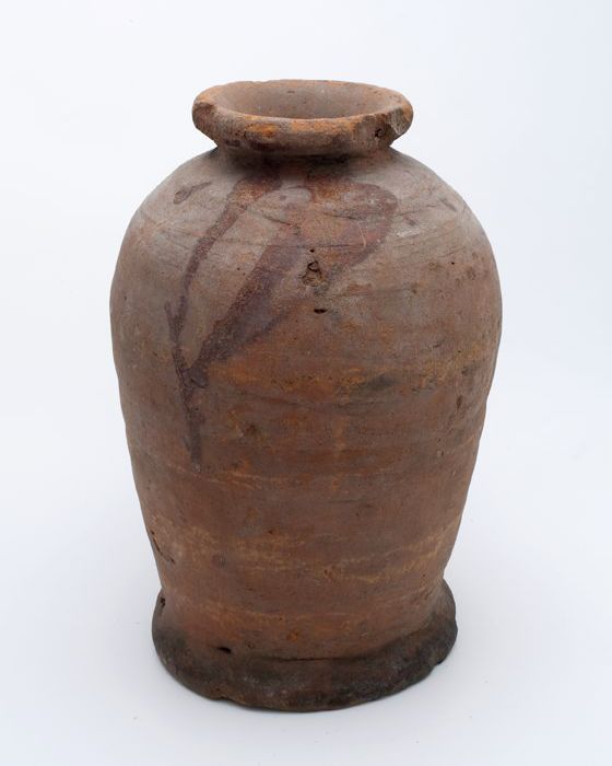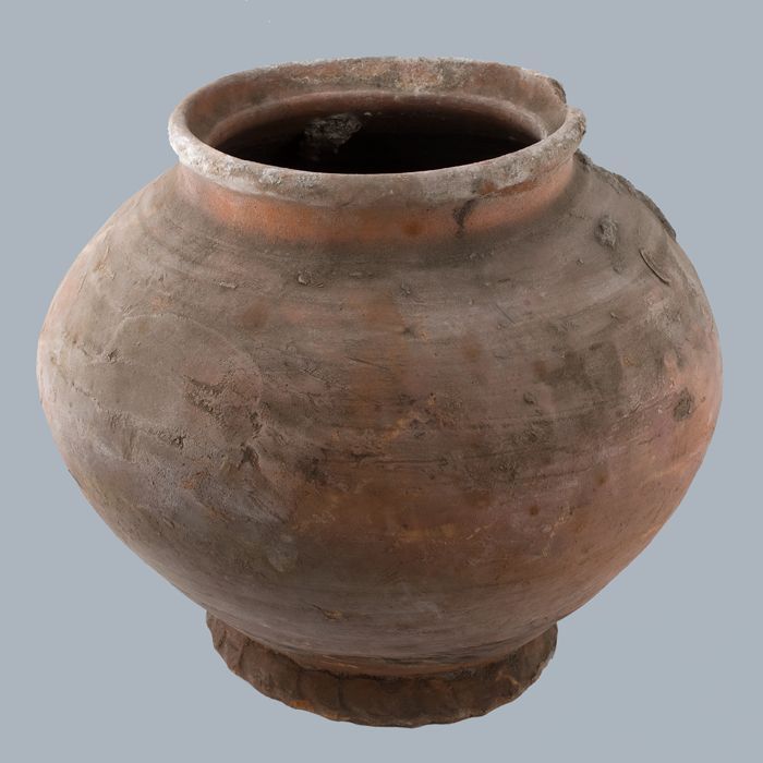 Aardewerk voorraadpot op geknepen standring, gedrong...