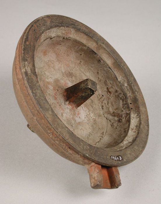 Steengoed deksel van dik aardewerk met drie diepe ga...