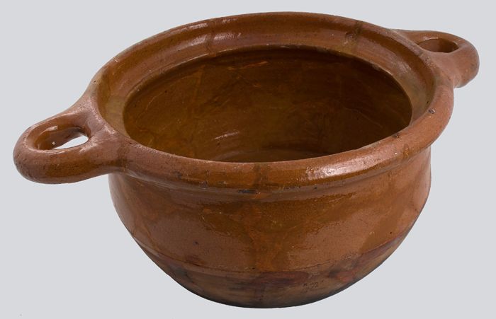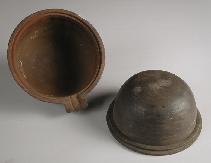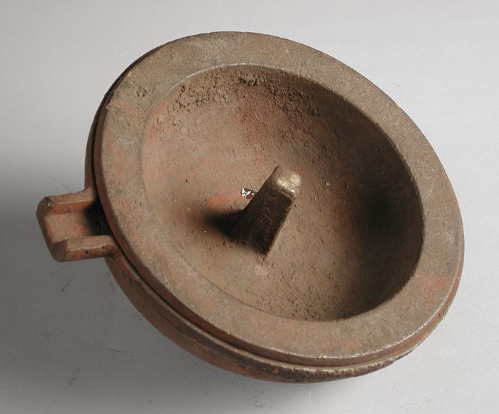 Aardewerk steelpan op drie poten, dekselrand en omho...