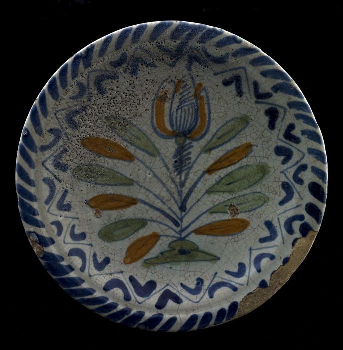 Majolica schotel met polychrome tulp als voorstellin...