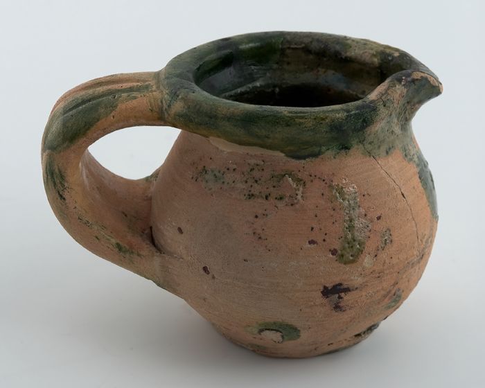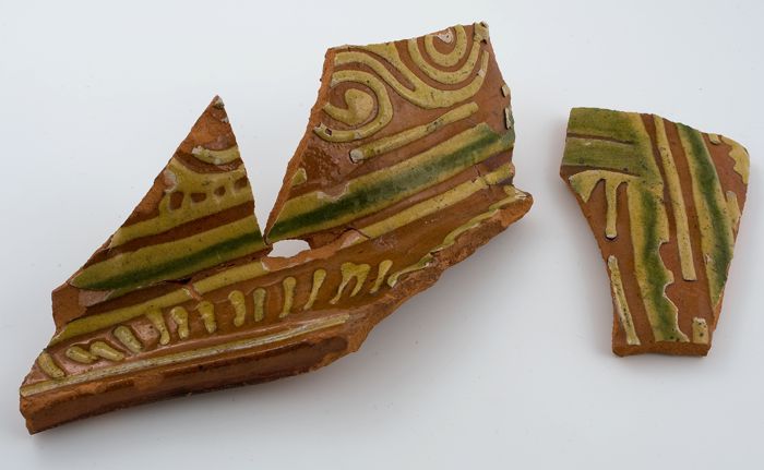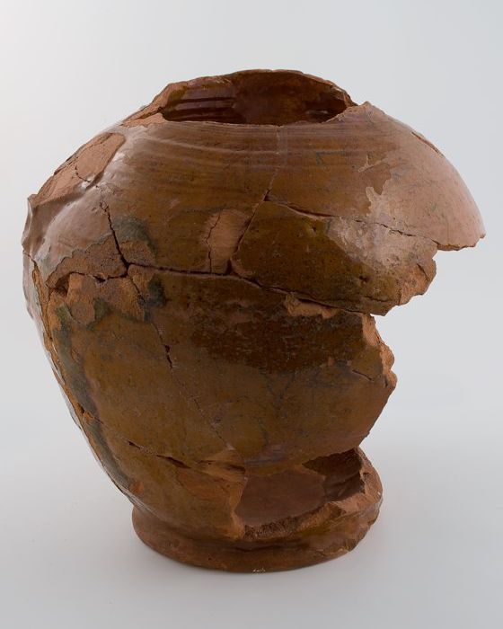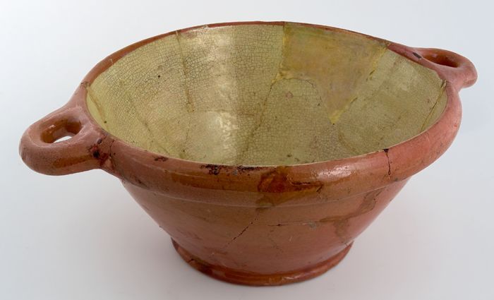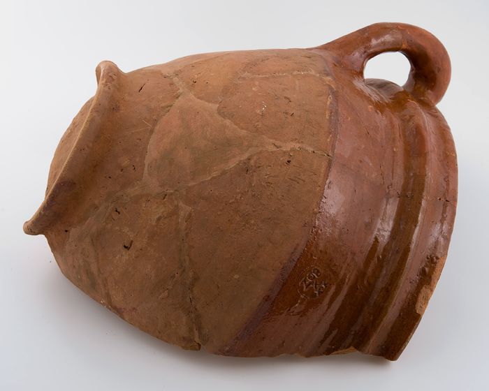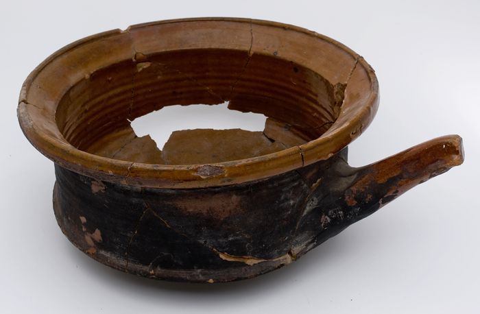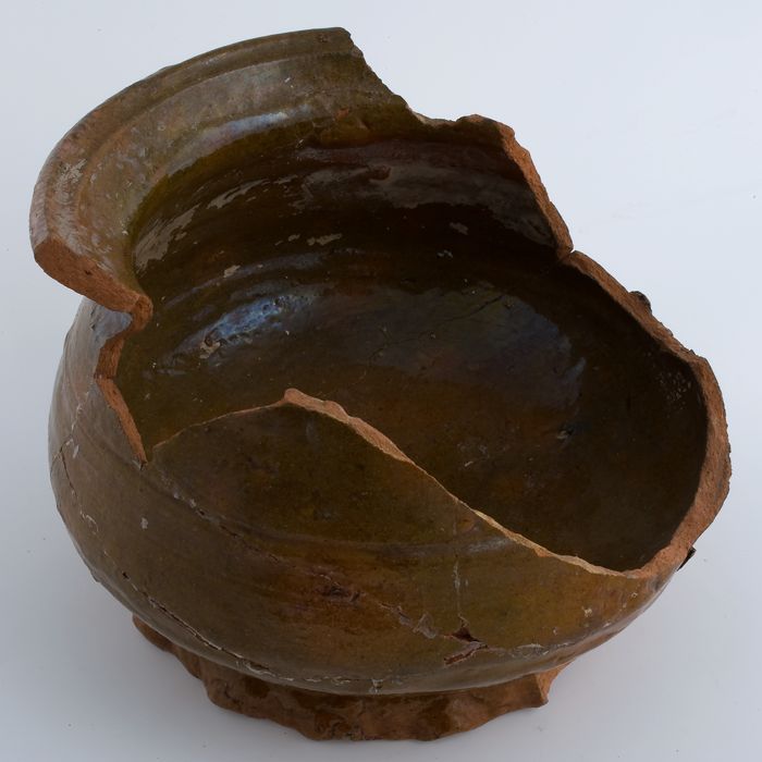 Fragment grote aardewerk kan op standring, geglazuur...