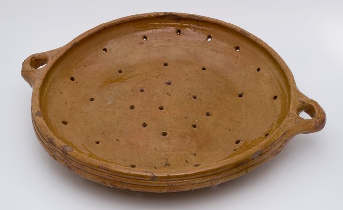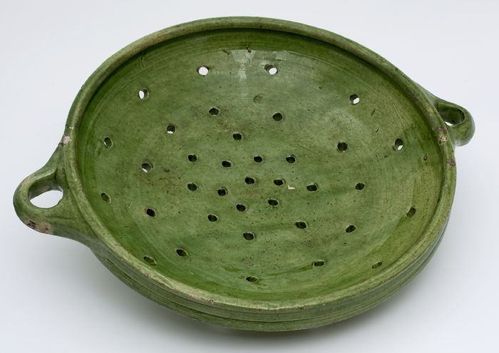 Laag aardewerk vergiet op drie poten, met twee ligge...