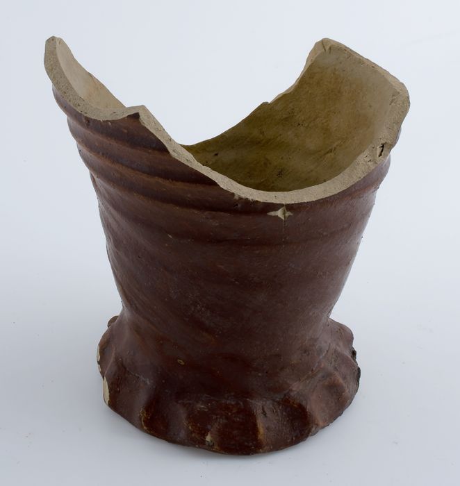 Fragment aardewerk kamerpot op geknepen standring, w...