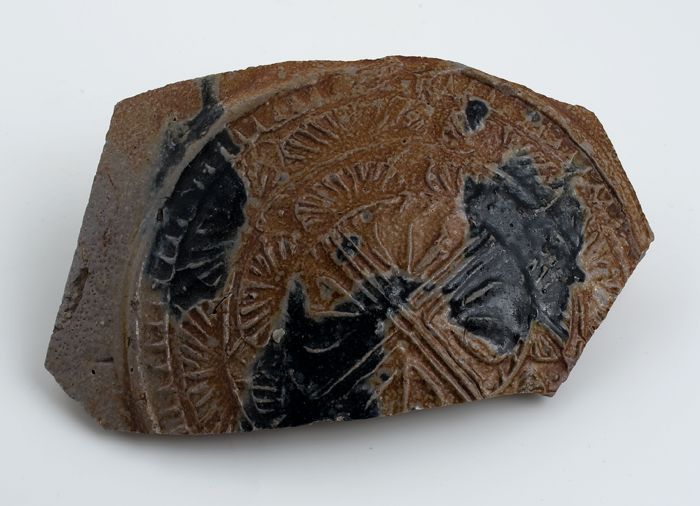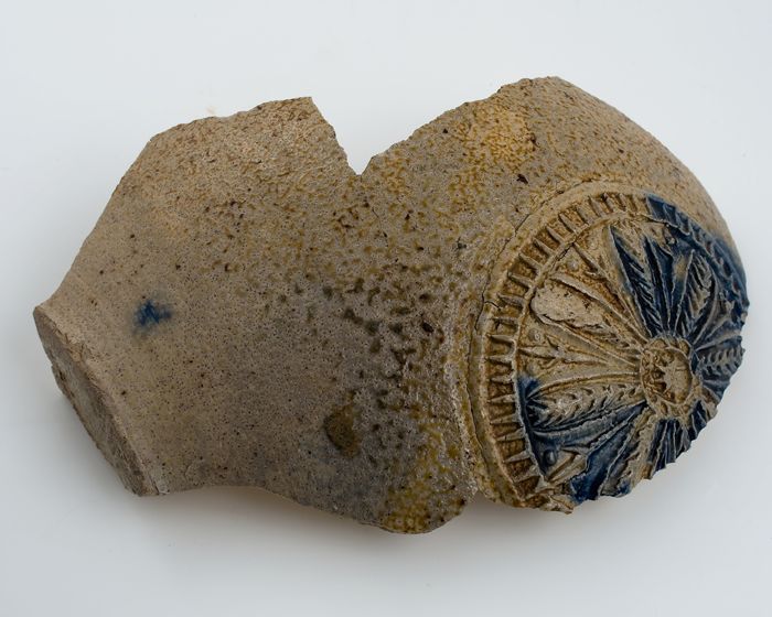 Buikfragment van steengoed baardmankruik met cartouc...