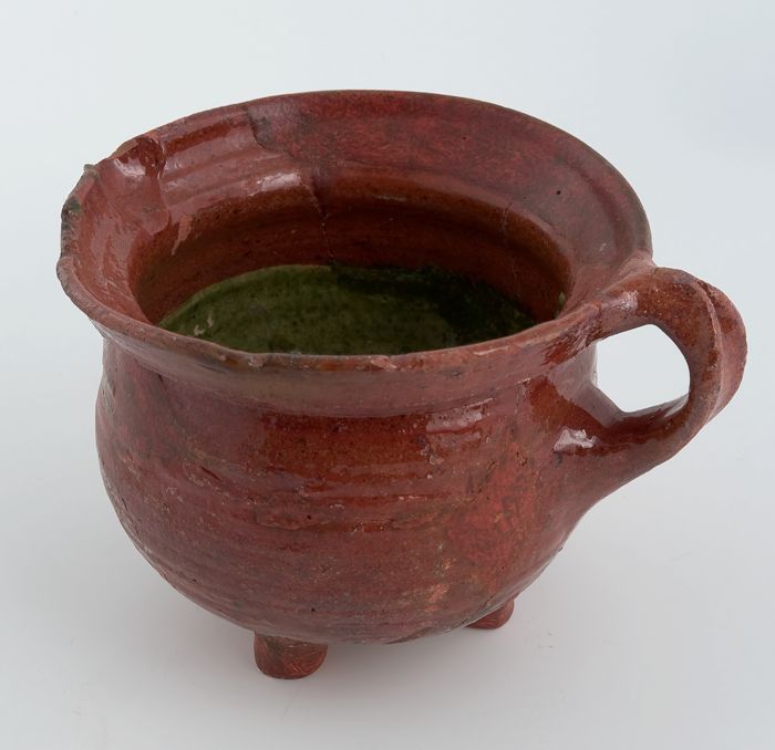 Aardewerk kookkan op drie poten met schenklip en ban...