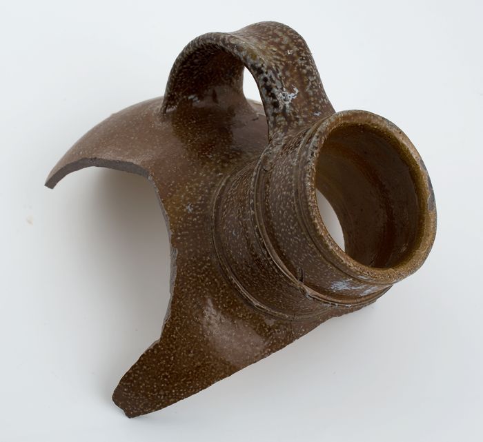 Halsfragment van kogelronde steengoed kruik met oor