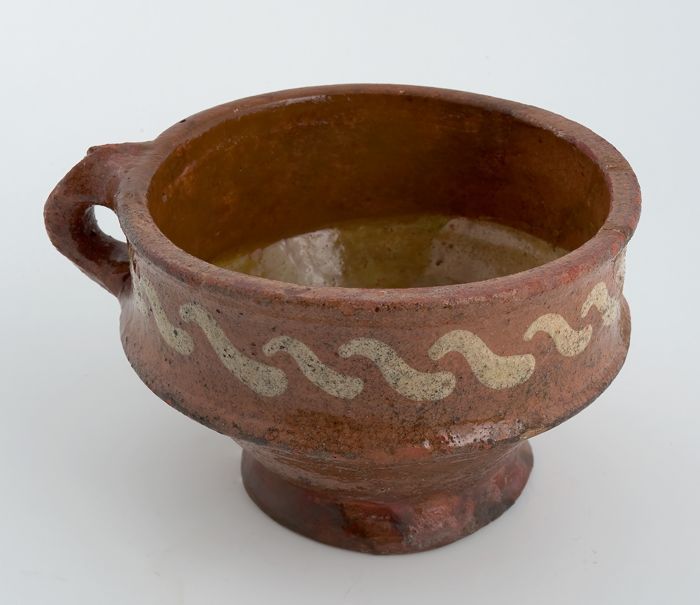 Grote aardewerk beslagkom op standring, twee staande...