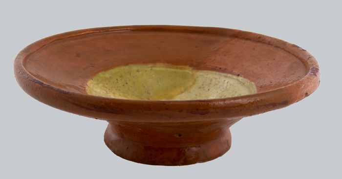 Aardewerk test op standring met aan buitenrand gele ...
